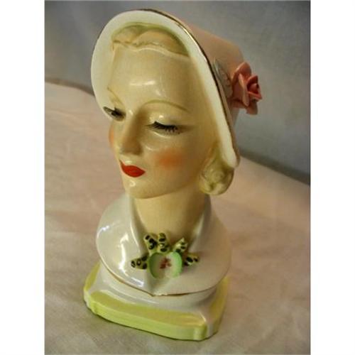 Elegant Head Vase of a Lady with long eyelashes, deep red lips, and rouged cheeks. She has a pink porcelain rose on her hat, and another green and yellow broach on her blouse.