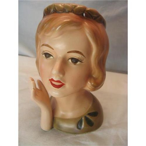 Elegant Head Vase of a Lady with brown detailed eyes, lashes and brows, and deep ruby red color lips. She is holding her hand up. The vase is numbered by the manufacturer, 50/427.