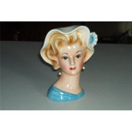 Featuring at todays auction is a beautiful Head Vase. Inarco,Napco,Lefton, or Ruben? She is dressed in a pastel blue dress with a beautiful ruffled hat which has a lovely blue flower that matches her dress. Lovely faux earrings. Her hair is wavey and colored sandy brown ahd white. Tilted head. Dark eyes and red lips. She is also highly glazed. She measures: 5 3/4 inches tall; base measures 3 1/4 inches long and 2 1/4 inches wide; Depth measures 4 3/4 inches She has no cracks or chips. The bottom is stamped in black with the number: 6525.