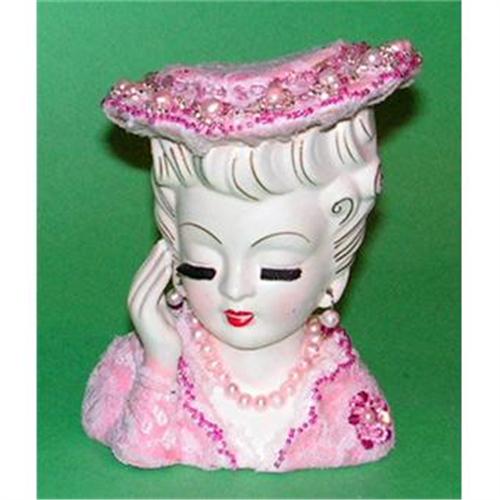 This ornately decorated head vase referred to as the "Headache Lady" in David Barron's book entitled "Collecting Head Vases". She wears a lovely gown of antique lace in a delicate shade of pink and dark pink beaded trim - her head is adorned, where the opening of the vase is with a matching pink lace hat encrusted with pink glass jewels, Swarovski crystals and tiny pink beads. which look to have been hand stitched to decorate her outfit. Her elegant accessories include a necklace of vintage beads, jeweled earrings and a bead and crystal brooch. The attention to detail in her decoration is truly remarkable. It is likely that she is a one of a kind item, in pristine condition. There is no maker's mark, but the original label from 1963 is still intact on the bottom of the vase. She measures 5 1/2 inches tall and is in excellent condition, without any damage to the clothing, jewelry or accessories.