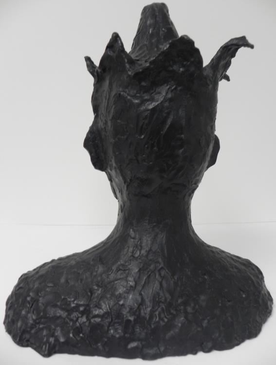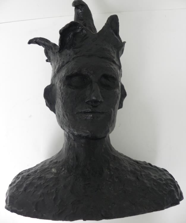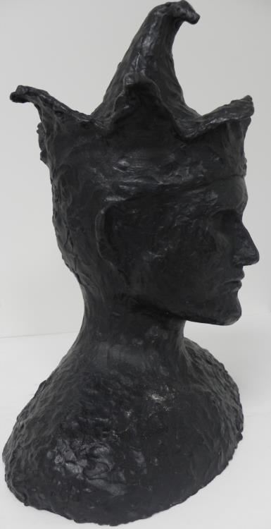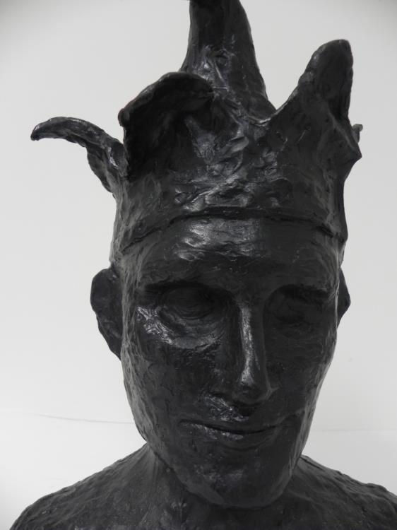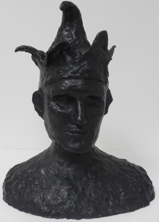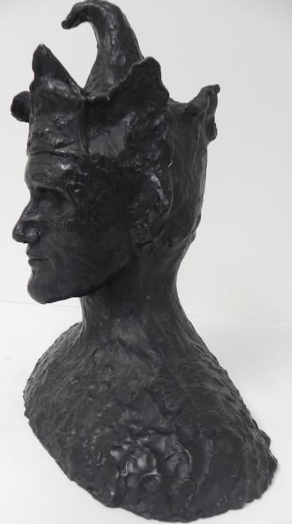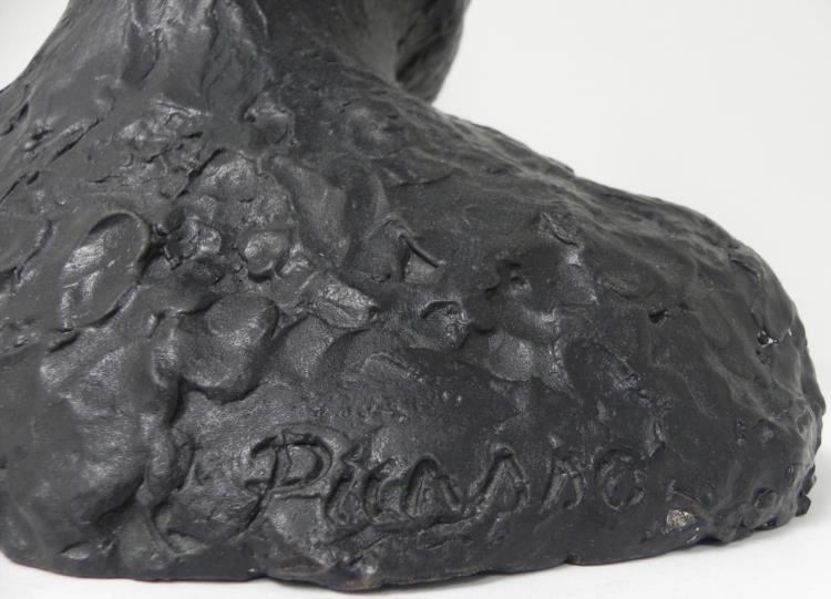 Head of Jester bronze sculpture bust with black patina after Pablo Picasso is said to be only one of 10 from the last cast of the retired mold after Head of Jester, elsewhere known as "Le Fou." 'Picasso' (on the back) from the cast. The original is listed in Picasso, The Sculpture Catalogue Raisonne by Werner Spies R4Title: Head of JesterArtist: PicassoMedium: Cooper/Tin alloy (unknown ratio) black patinaDate: Circa 1978Cast: 4th/FinalSignature: Picasso, back of sculpture - from the mold Published by FEMWeight: 37 lbs.Dimensions: 18" (height) x 10" (depth) x 16" (wide)Condition: Excellent*The bust that is offered is not from the original cast, it is from the last cast of the last mold from FEM.Biography Picasso's fascination with the life of the circus performer; a world characterized by artifice, decoration, masks and costumes. The present work symbolizes a shift for Picasso from the Blue to the Rose period and marks a new chapter of iconography for the artist. Werner Spies discusses the creation of the original work, inspired by Picasso's close friend, the writer Max Jacob, as "nothing less than the description of a costuming, the transformation of a portrait of Max Jacob into an allegory" Roland Penrose also describes the birth of the original sculpture as "It was begun late one evening after returning home from the circus with Max Jacob. The clay rapidly took on the appearance of his friend, but the next day he continued to work on it and only the lower part of the face retained the likeness. The jester's cap was added as the head changed its personality" The theme of the Jester's cap and the "crown" played an important role in the work of Picasso during this period. Spies examines Picasso's fascination with this device as he make clear that "Picasso uses the cap not merely as an attribute for particular figures, but as an autonomous, visually enlivening accessory. He is clearly attracted by the geometric structure of the cap, a large triangle surrounded by lower, smaller ones; in many pictures it appears as an echo of the jester's diamond-patterned costume"*Retrieved from: https://bitdazzle.com/products/365795/picasso-bronze-sculpture-head-of-jester