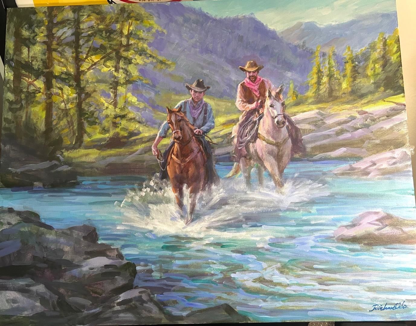 Cowboys head home after a day on the north 40. Original 24x30" acrylic on stretched canvas by American artist Richard Ho. w/COA.