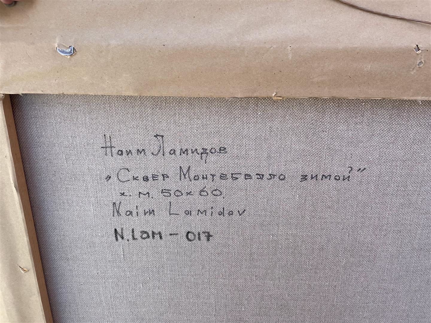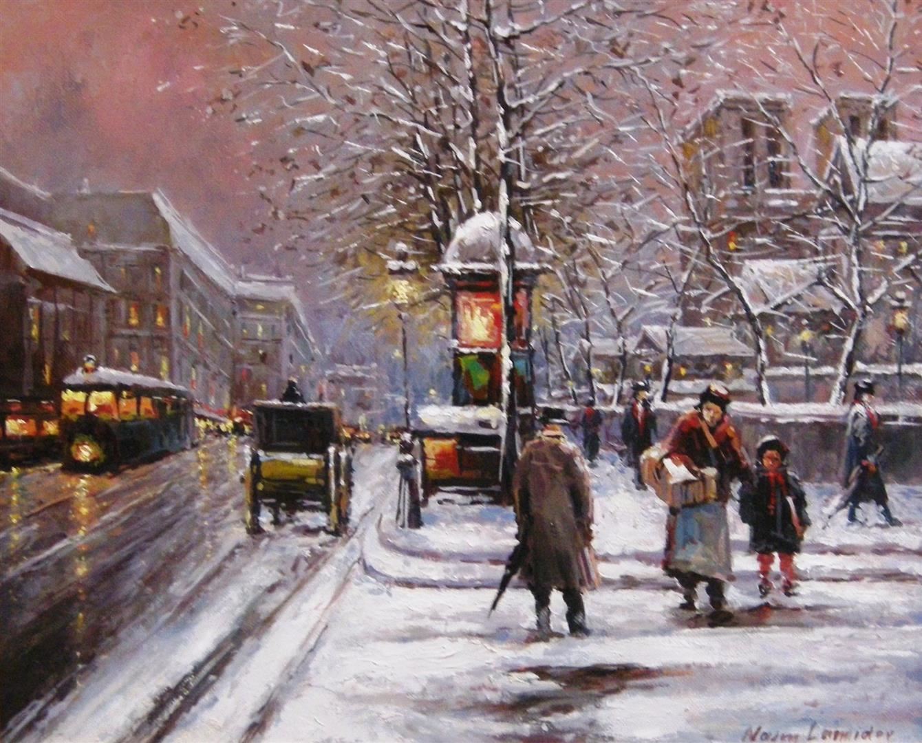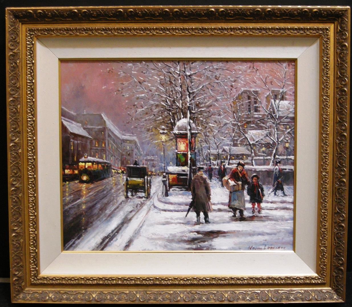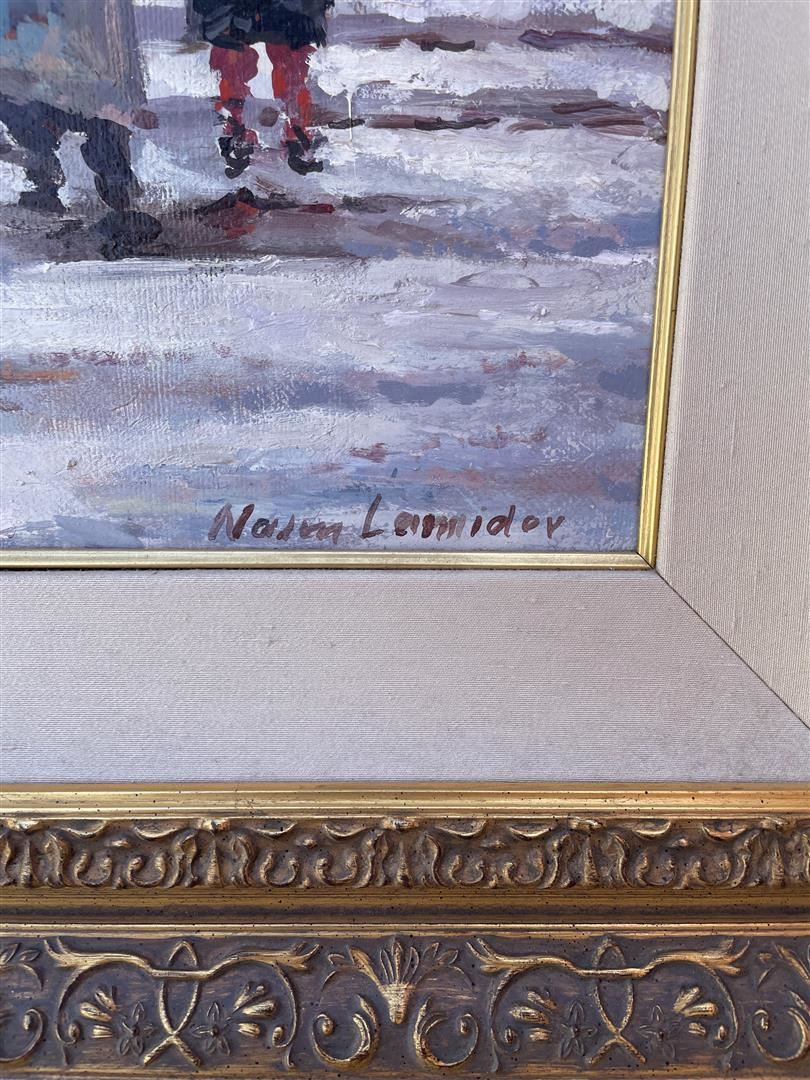 On a cold, wintry day, people hurry home on foot, in a horse and buggy or in a trolley car, in Naim Lamidov's Impressionistic oil on canvas. The painting measures 20 x 25; framed image measures approx. 32 x 37.