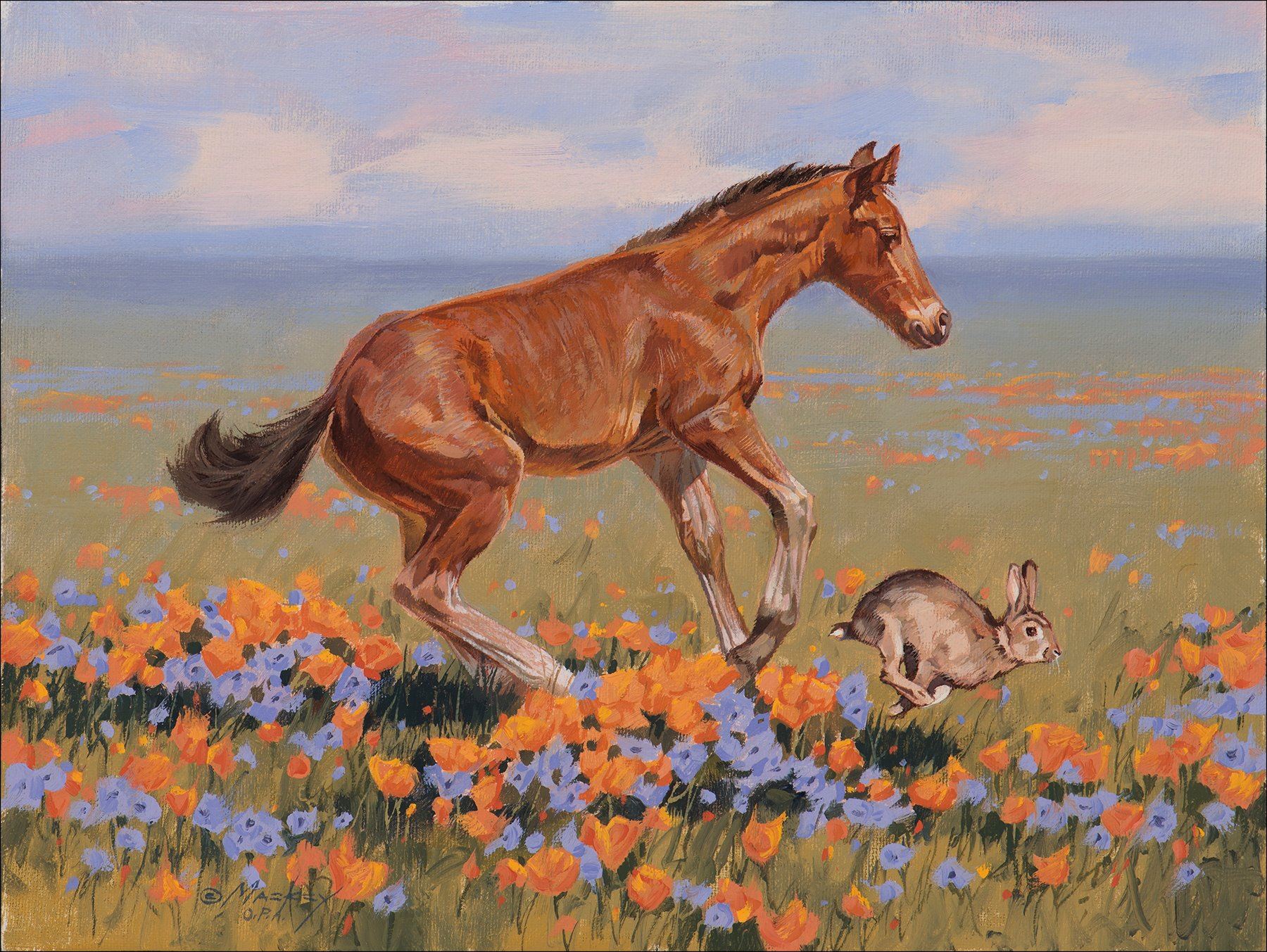 Artist: Kim Mackey. Title: Heads Up. Artwork size: 9" x 12". Frame: 15" x 18". Medium: Oil. Artist's description: A new born colt in a spring meadow is surprised by a rabbit. Both frolic in the pasture enjoying their new friendship.