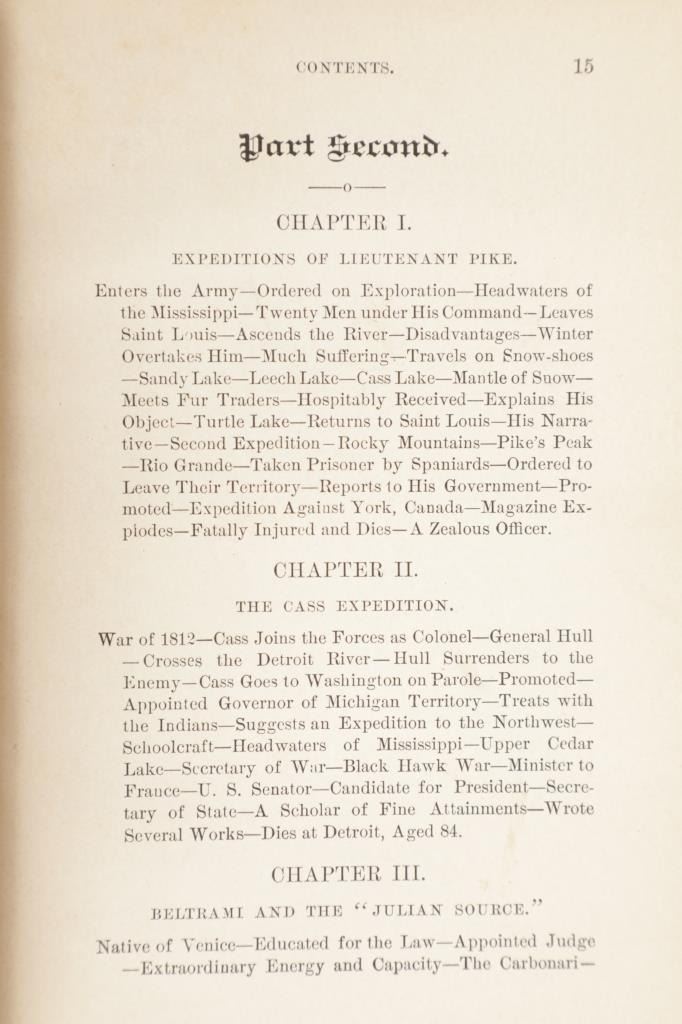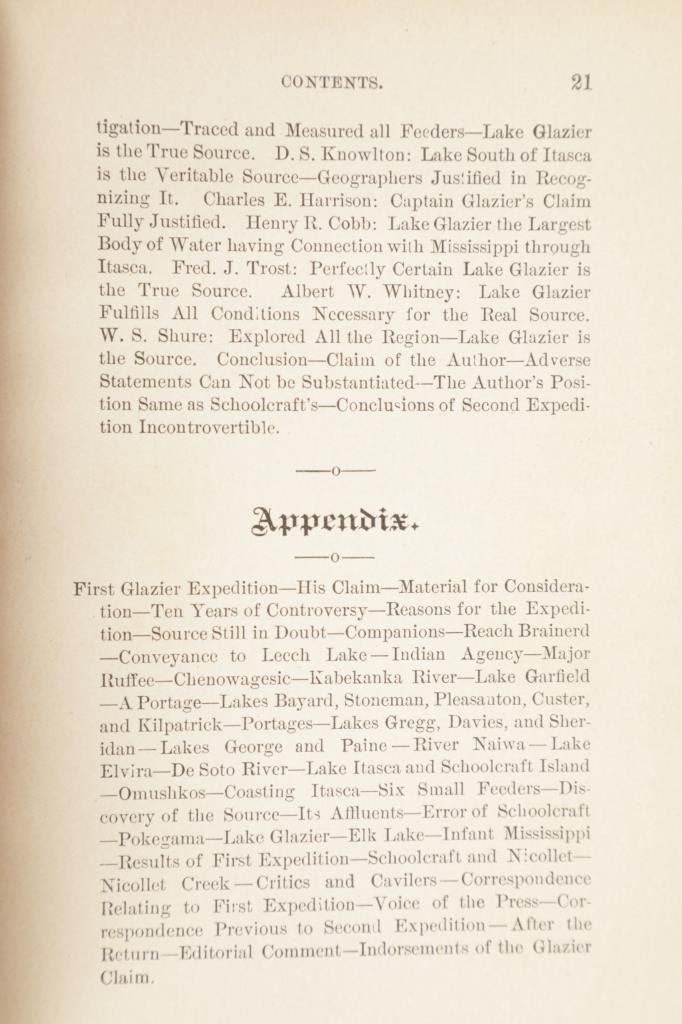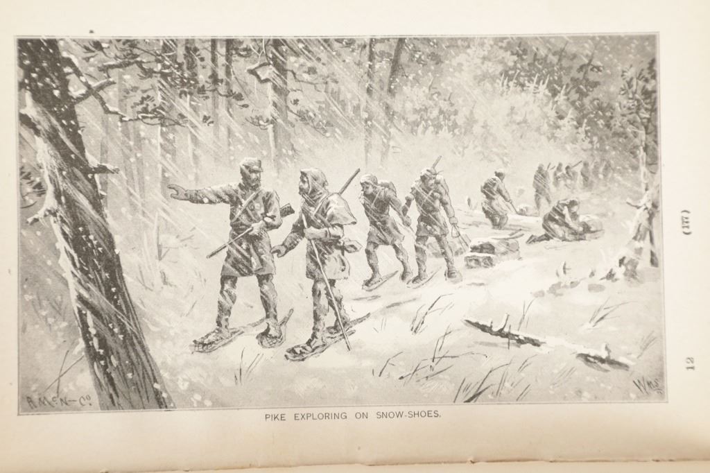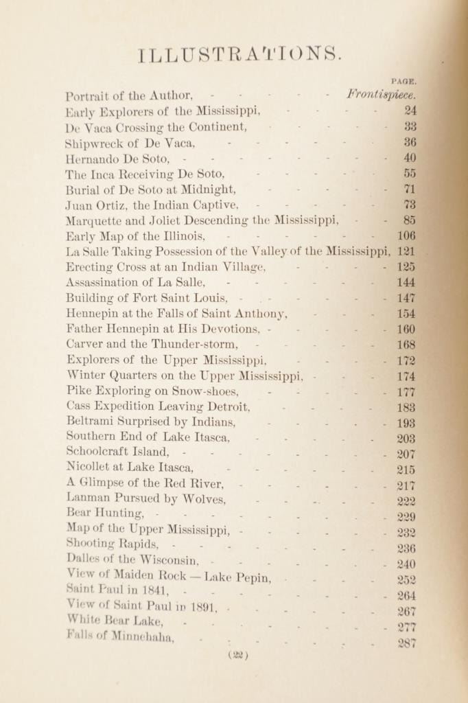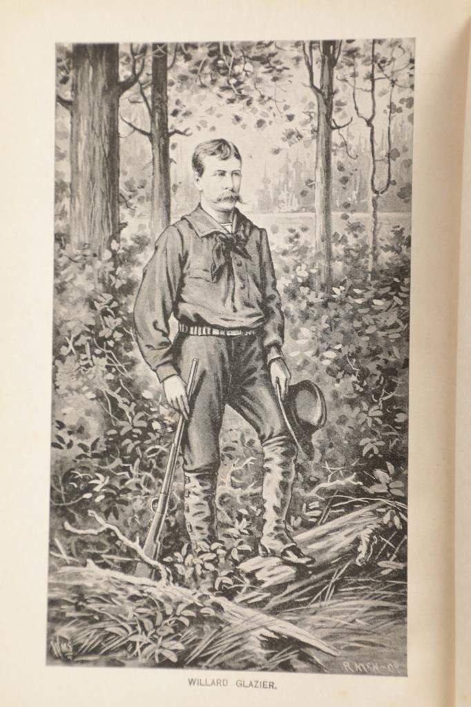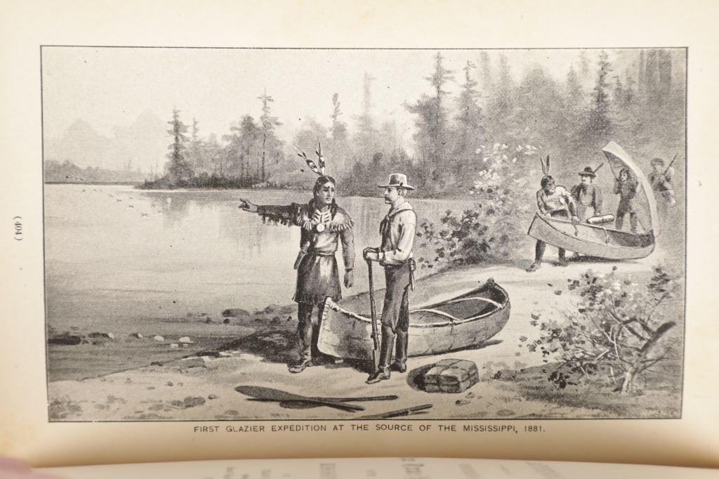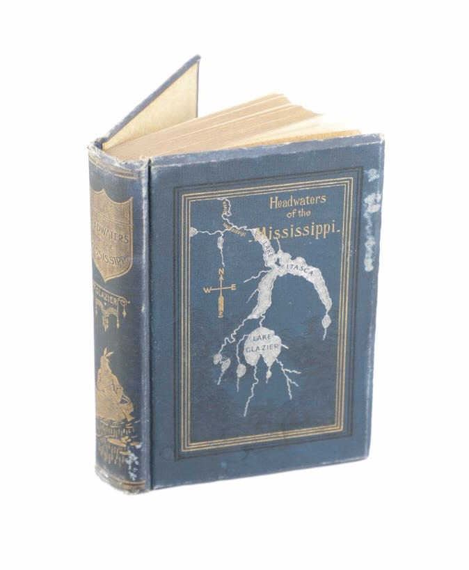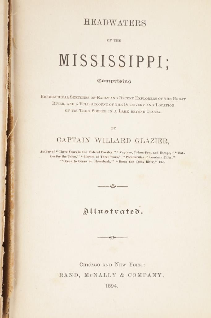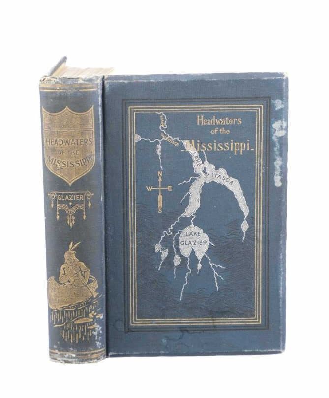 For your Consideration is this 1894 illustrated edition of “Headwaters of the Mississippi” by Willard Glazier, publisher Rand, McNally & Company, Chicago and New York. Captain Willard Glazier (1841-1905) led an expedition in 1881 that discovered the "True Head" of the Mississippi. Previous efforts by others had failed or unknowingly fell short. In 1832, another explorer had discovered Lake Itasca, thinking it was the source. Indian tribes in the area denied the assertion. Glazier discovered another lake lying to the south of Itasca, at a higher elevation, that fed into Lake Itasca. This lake now bears Glazier's name. The book is illustrated throughout with drawings, maps, and even the first photographs taken of the area by another on the expedition. The blue cloth bound gold and silver gilt stamped illustrated hardcover is in nice condition, front cover gilt is bright, spine gilt is fading. Front cover illustration depicts lakes Glazier and Itasca and tributaries along with the Mississippi river in silver gilt, title and map compass rose in gold gilt. Intact pages exhibit age tanning and slight foxing throughout. Measures 1lb, 14oz.