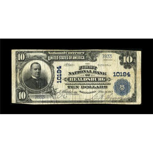 <B>Healdsburg, CA</B></I> - $10 1902 Plain Back Fr. 628 <B>The First NB</B></I> Ch. # 10184<BR> The signatures remain visible on this pleasing <B>Fine</B></I> note from this Sonoma County issuer.<B></B></I><BR><I>From The Kansas City Collection.</B></I><BR><BR><b>Shipping:</b> Coins & Currency (<a target="_blank" href="http://www.heritageauctions.com/common/shipping.php">view shipping information</a>)