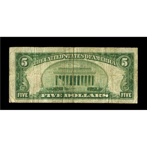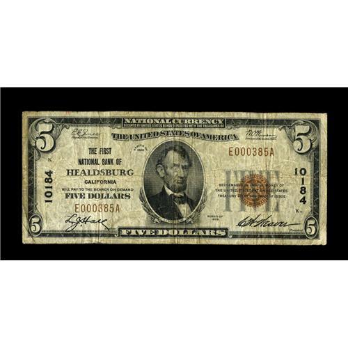 <B>Healdsburg, CA</B></I> - $5 1929 Ty. 1 <B>The First NB</B></I> Ch. # 10184<BR>While large notes from this much visited Sonoma County community are readily available, small examples are another matter completely, as this bank, the only issuer of Series 1929 notes in town, liquidated in January of 1930 after barely five months of small size issue. Until recently, no Series 1929 specimens were known from here, but in May of 2004 a specimen grading Very Good turned up in a Stack's sale, where it realized $5750. This example is new to the census and the second Series 1929 note known from here. It's a bit nicer than the one which sold in 2004, and will likely fetch just about the same figure in 2007. <B>Fine.</B></I><BR><BR><b>Shipping:</b> Coin/Currency (<a target="_blank" href="http://www.heritageauctions.com/common/shipping.php">view shipping information</a>)