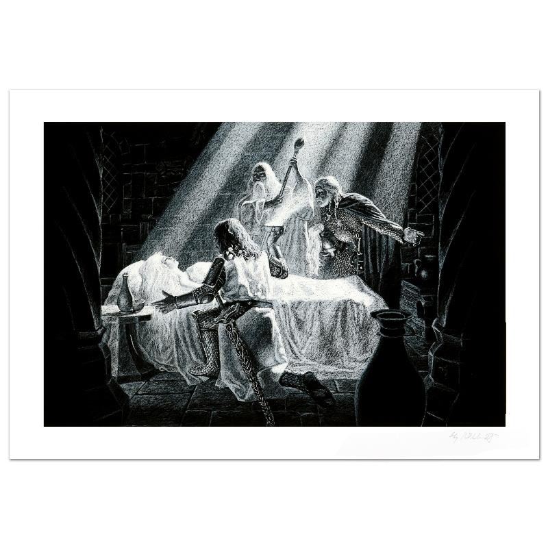 Known world wide for his fantasy and science fiction illustrations, Greg Hildebrandt has created an abundance of fascinating artwork including, and most notably his illustration work for J.R.R. Tolkien's 'The Hobbit' and 'Lord of the Rings'. "Healing of Eowyn", originally created in the 1970's for Ballantine Books, is a limited edition giclee on paper, numbered and hand signed by Greg Hildebrandt! Includes Certificate of Authenticity! Measures approx. 34" x 24" (with border), 30" x 19.5" (image).