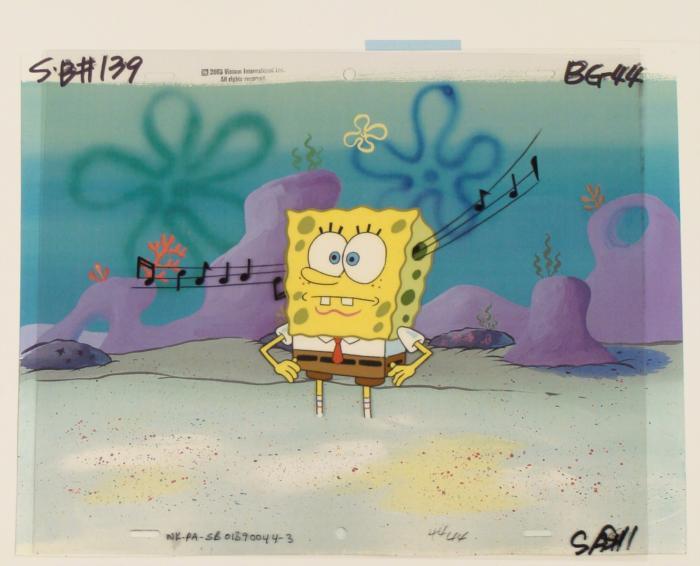 To create production cels, the original animator's drawing is transferred onto an acetate cel (by hand-inking and/or photo copying). The cel is then hand-painted on the reverse side. The background accompanying this set-up is a hand-painted original production background. The printed background is ready to be matted and framed. It is a colored background with a cel and has the animator's notations at the bottom of the background and the cel. The background is a printed reproduction background. The cel has multiple layers; first is the music notes and then the second cel is SpongeBob. There is slight paint fade to SpongeBob's outline.