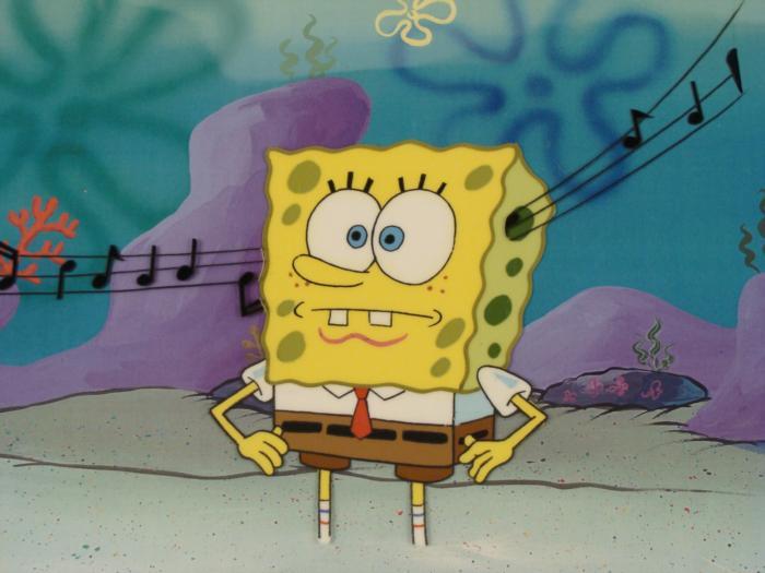 This animation cel and reproduction background are from the Nickelodeon TV show SpongeBob Squarepants. The story takes place under the deep blue sea in Bikini Bottom, where SpongeBob resides. SpongeBob, who is a yellow, porous sponge, is your typical happy-go-lucky character, as he is always cheerful and enjoys making people laugh. Patrick Star, SpongeBob's neighbor who is a starfish, is your average children's show idiot, as he boasts knowing nothing and is often getting himself into ridiculous situations. Between the homes of these two lies the home of the miserable Squidward, a squid, who is known for being grouchy and playing tricks on SpongeBob and Patrick. Both SpongeBob and Squidward work at the Krusty Krab, a fast food business run by the greedy money-loving Mr. Krabs, a crab, the arch rival of the evil, possibly misunderstood, Plankton. Another neighbor, Sandy Cheeks, an athletic squirrel who normally wears an astronaut's space suit, was introduced in "Tea at the Treedome." She spends most of her time inventing and experimenting. SpongeBob is hearing some music.Original Printed Background and Animated Cel Overall Size of Background: 11" x 18" Overall Size of the Cel: 10 1/2" x 12 1/2" Very good condition This is an original hand-painted cel set-up used in the production of an episode of "SpongeBob SquarePants." Each one-of-a-kind set-up represents a slight change in position of the characters. When individually photographed and projected in rapid succession, the images appear to move.