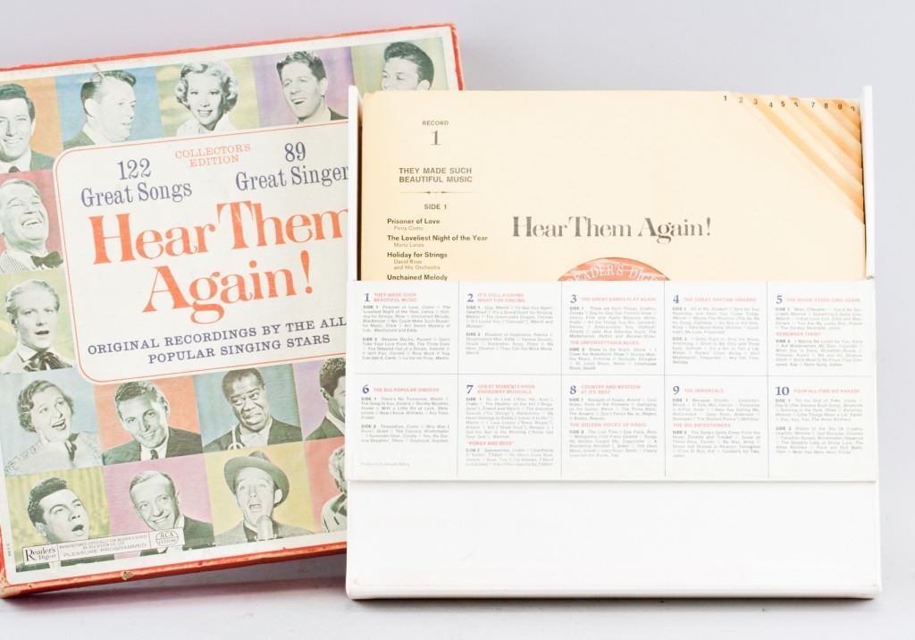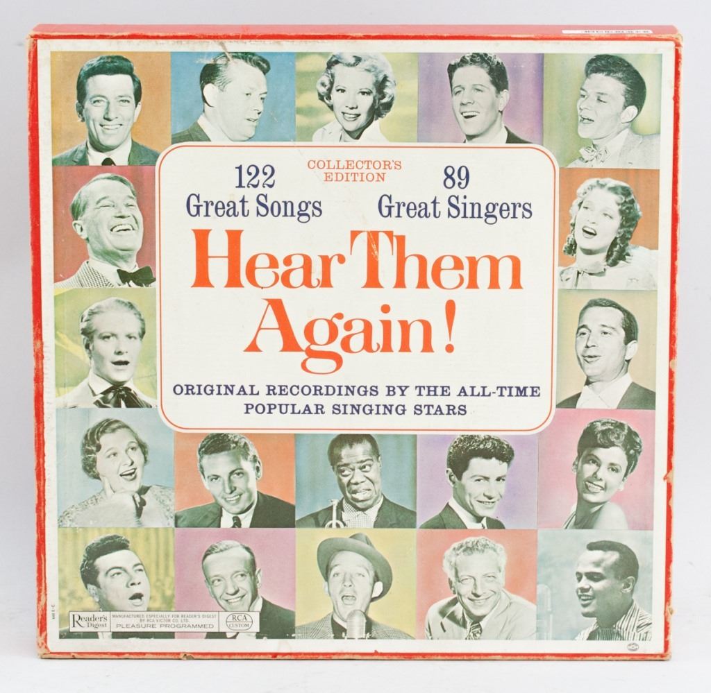 Collector's edition disks. "Hear Them Again", featuring original recordings by the all-time popular singing stars. 32 x 32 cm (12.5 x 12.5 in).