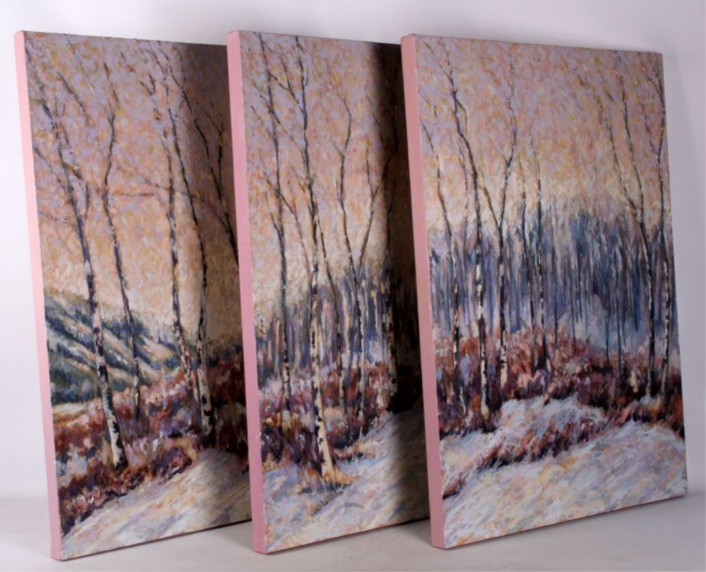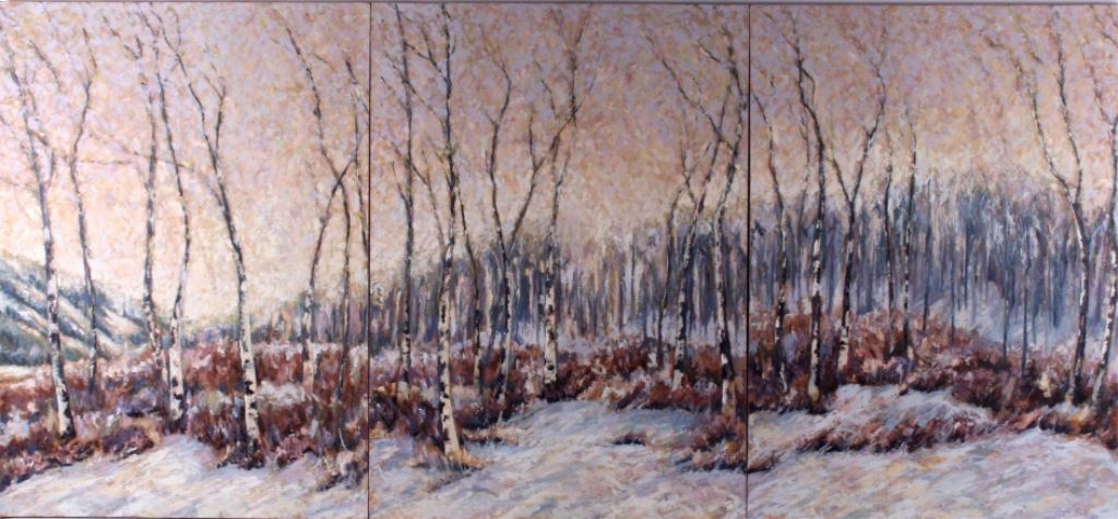 This is an original work of art oil on canvas by Roger Ring. The piece is title "Heart Butte" Triptych Oil on Canvas and hand signed. This is a triptych or three piece of art showing a Glacier National Park Montana winter sunrise against the birch forest. Roger Rink is a well accomplished East Glacier, Montana artist. Each canvas is 44.25"x32". Full piece is 96" across.