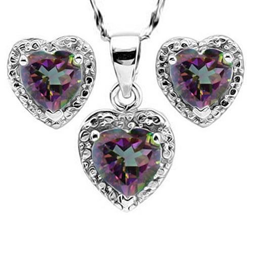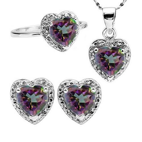 Halo style heart cut 5CTW Mystic Topaz ring, earrings and necklace set. Mounting is Platinum over Sterling Silver for added brilliance. Accented with 0.03ctw genuine diamond. Includes sterling silver 18" twist chain and friction backs. Size 7. 6.7g