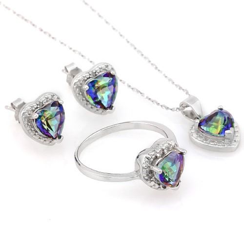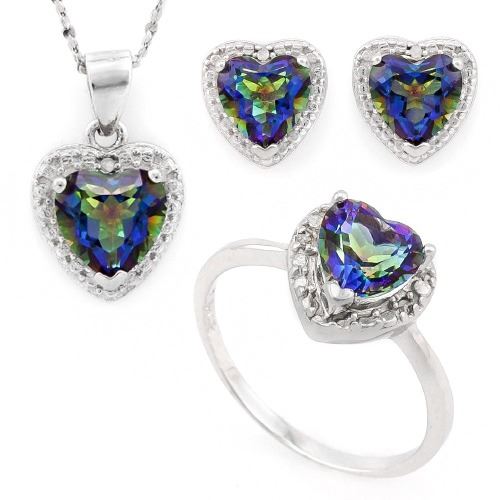 Halo style heart cut 5CTW Ocean Mystic Topaz ring, earrings and necklace set. Mounting is Platinum over Sterling Silver for added brilliance. Accented with 0.04ctw genuine diamond. Includes sterling silver 18" twist chain and friction backs. Size 8. 6.3g