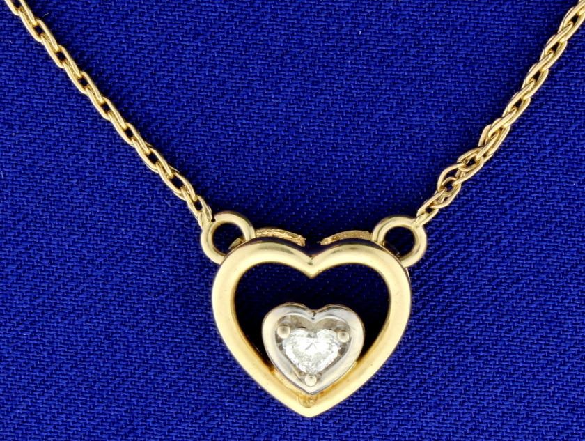 In 14k yellow and white gold. The high quality heart shaped diamond is 0.30cts, SI clarity and I color and is set in 14k white gold with a heart 14k yellow gold "halo". Chain is 18 inches long - 14k with a lobster claw clasp. 6.4g