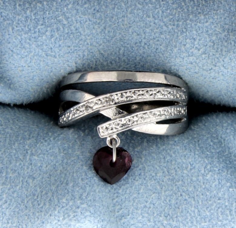 Contains a 1 carat Garnet, heart-shaped gemstone accented with two .01 ct Diamonds. Set in platinum over a sterling silver setting. Size 7.25. 3.2g.