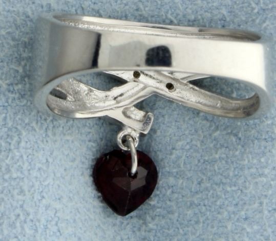 Contains a 1 carat Garnet, heart-shaped gemstone accented with two .01 ct Diamonds. Set in platinum over a sterling silver setting. Size 7.25. 3.2g.