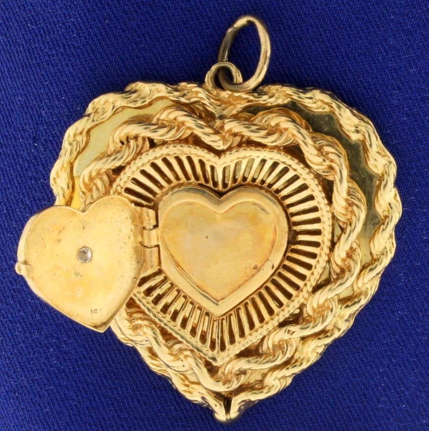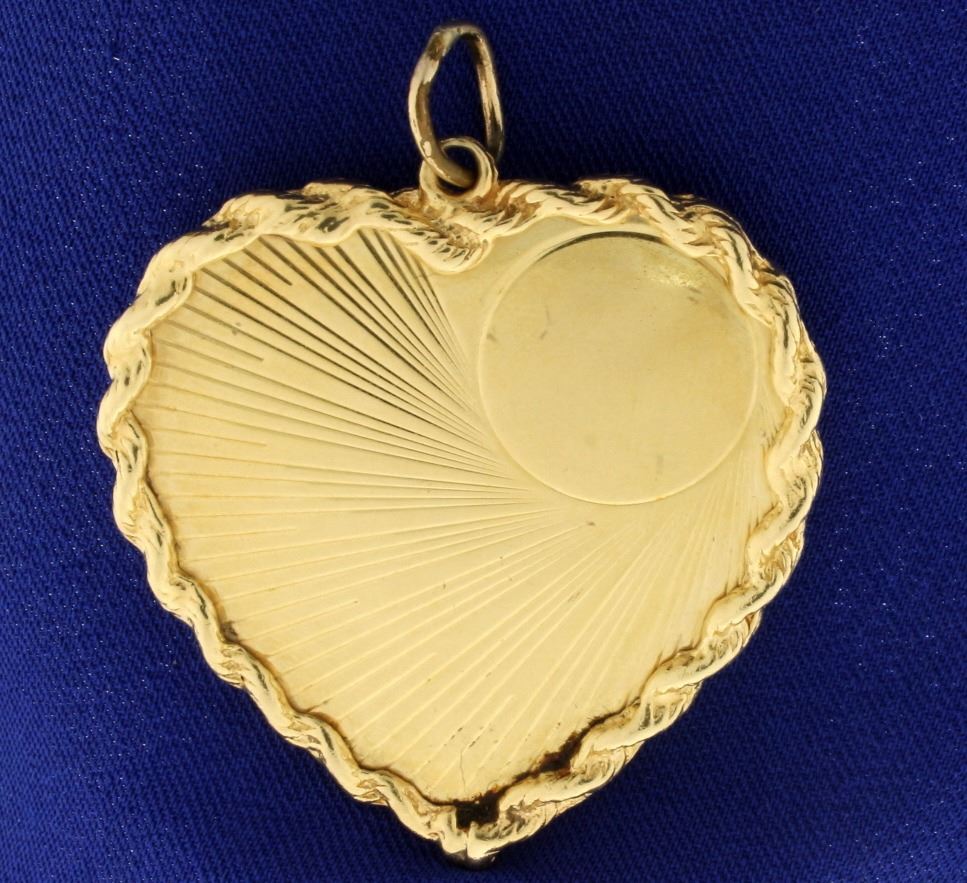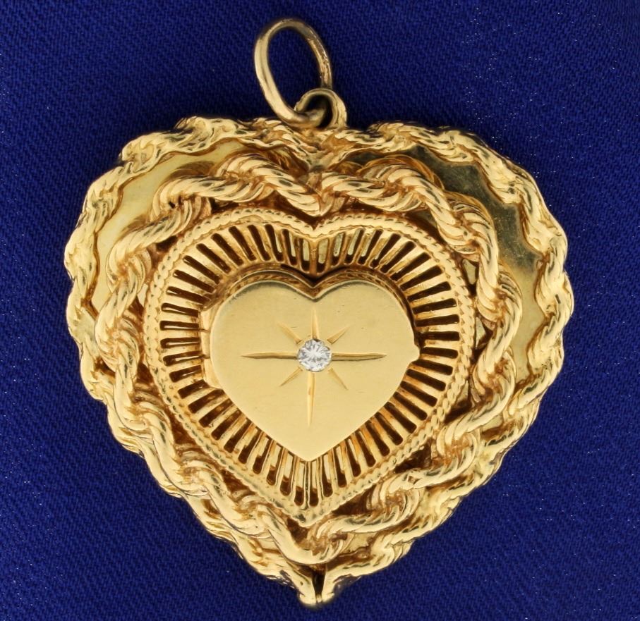 In 14k yellow gold. A .1ct diamond centered on locket, VS clarity/H color. 2 inches long with bale. Locket is heart shaped and 1/2 inch long. Room for inscription on back. 31.9g.