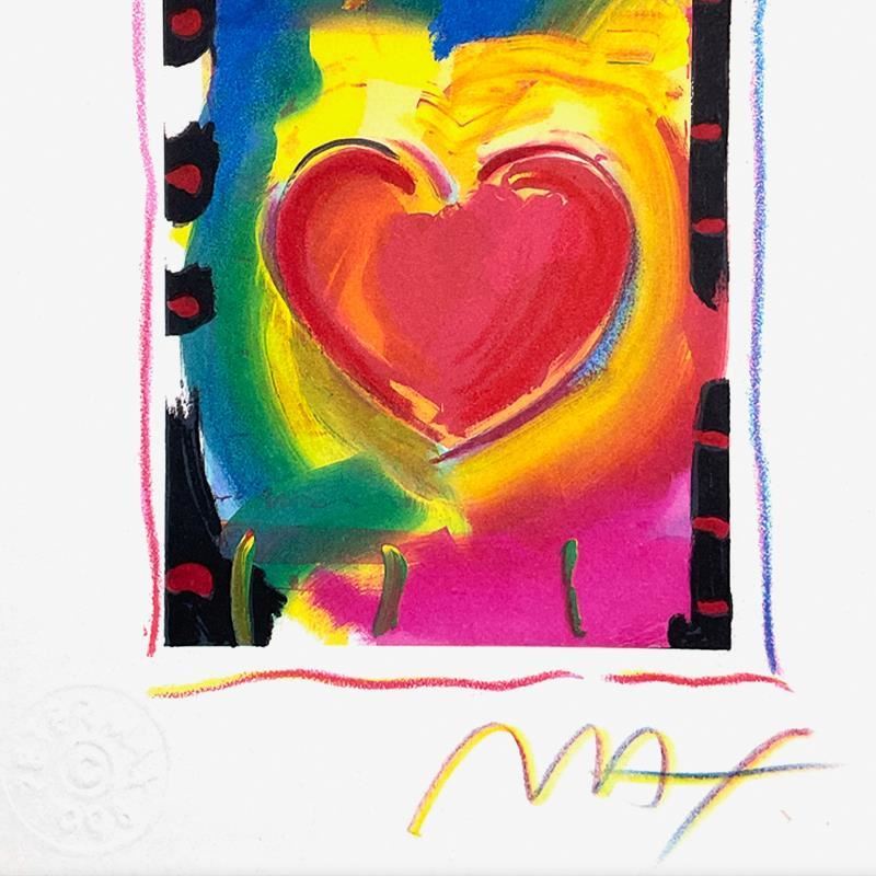 "Heart Series I" is a limited edition lithograph on paper by Peter Max, numbered and hand signed by the artist. This piece comes framed. Includes Certificate of Authenticity from Peter Max Studios. Measures approx. 15" x 14" (frame), 5" x 4" (image).