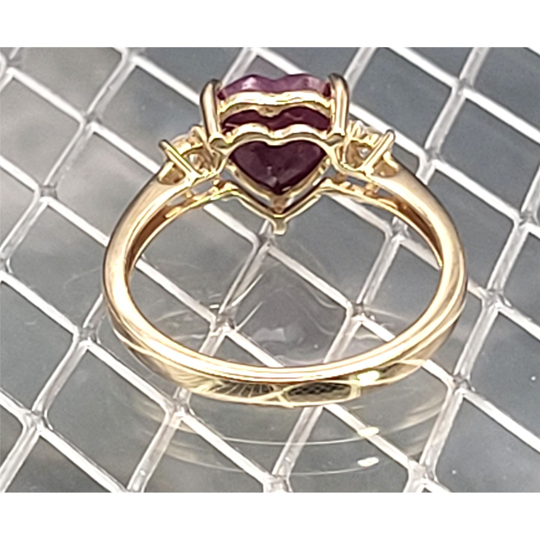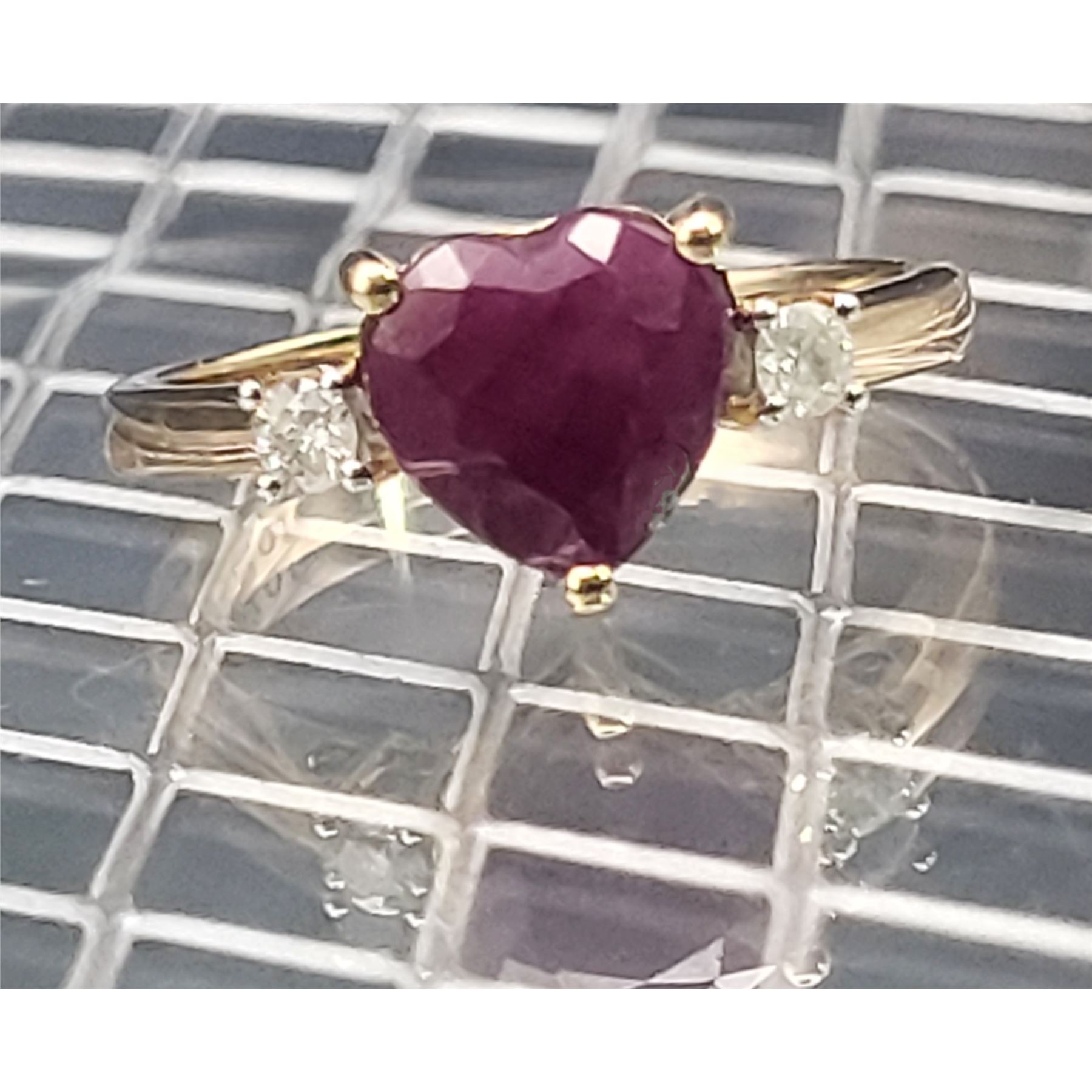 This 14 karat yellow gold ring features a 2.65 carat, heart-cut, genuine ruby* that is prong-set between two round, brilliant-cut, genuine, natural H-I color, I1 clarity, natural diamonds that total .14 carats total weight. The ruby is 8mm and displayed in cathedral shoulders that taper to an approximate 2.25mm shank. The ring is US size 7. 2.85 grams Admin: Q5743/15-ngrll