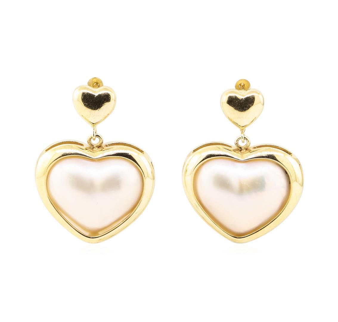 One pair of heart shaped dangle earrings with a drop of approximately 27 millimeters featuring: 14KT yellow gold weighing 9.1 grams containing two pieces of heart shaped mother of pearl.
