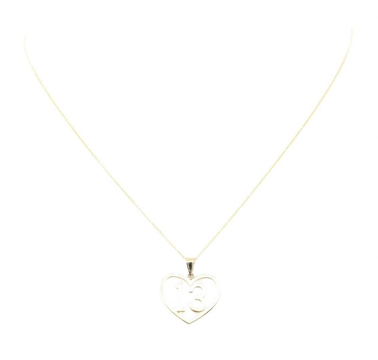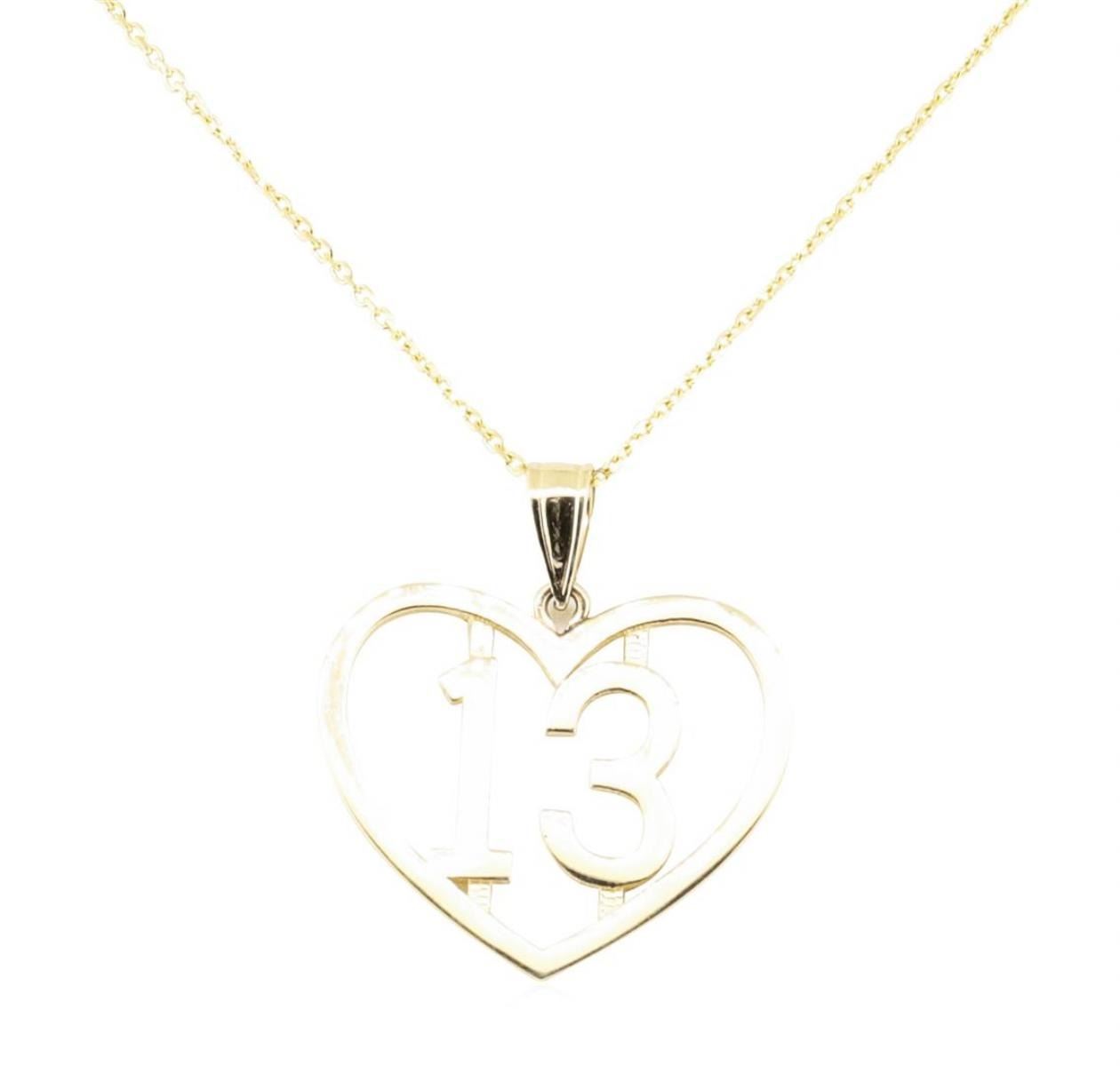 One heart shaped pendant with the number thirteen with a chain featuring: 14KT yellow gold weighing 2.4 grams. The chain is a 0.9mm rounded cable link chain measuring sixteen inches in length.