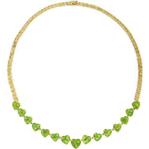<B>Peridot, Gold Necklace</B></I><BR><BR>The necklace features graduated heart-shaped peridot ranging in size from 8.90 x 8.50 mm to 11.00 x 10.50 mm and weighing a total of approximately 45.00 carats, set in 14k yellow gold. A box clasp with figure-8 safety secures the necklace. Gross weight 39.80 grams. <BR><I>Length: 18 inches</B></I> <B>Condition Report:</B> Necklace<BR><BR>Colored Gemstones: Peridot<BR><BR>Shapes: Heart<BR><BR>Gemstone Count: 1-25<BR><BR>Notes: Excellent condition. Peridot is bright, lively and well matched for color. Heart shapes are fantasy cut.<BR><BR><BR><BR><b>Shipping:</b> Miscellaneous Collectibles, Smal (<a target="_blank" href="http://www.heritageauctions.com/common/shipping.php">view shipping information</a>)