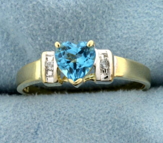 In 14K Yellow and White Gold. Contains a natural 6mm heart shaped Swiss Blue Topaz with bright blue color and excellent clarity. Also contains two high quality .01ct Diamonds, SI clarity/H color. Size 10. 2.8g