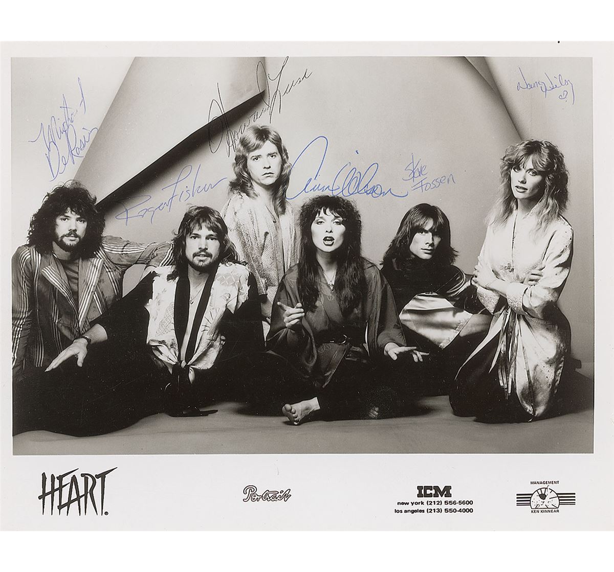 Glossy 10 x 8 Portrait Records publicity photo of Heart, signed in blue ballpoint by Roger Fisher, Ann Wilson, Steve Fossen, Michael Derosier, and Nancy Wilson, who adds a heart, and in black ballpoint by Howard Leese. In fine condition. An excellent, boldly signed photo of the band during the mid-1970s.