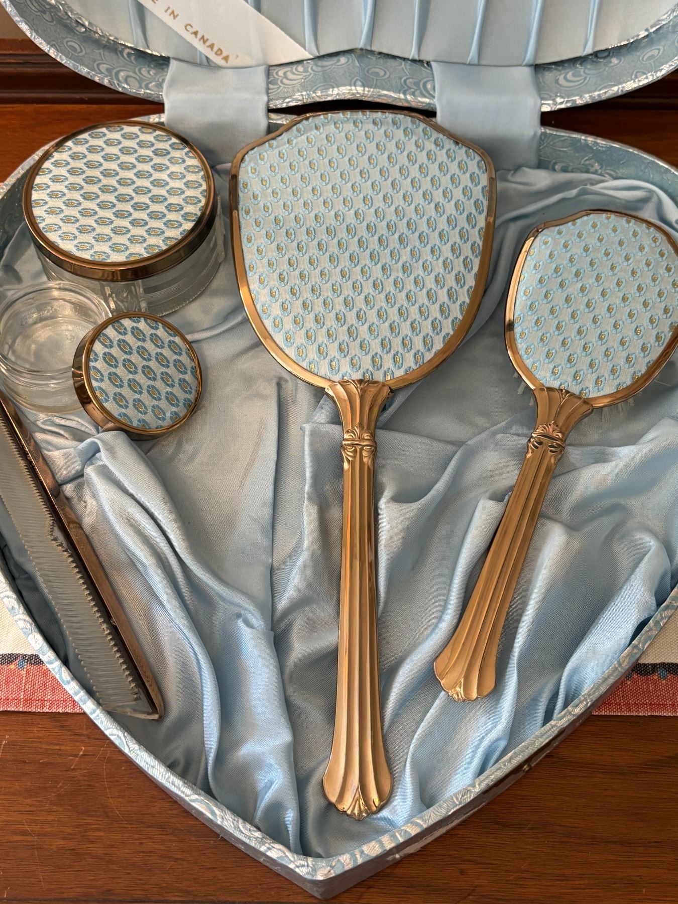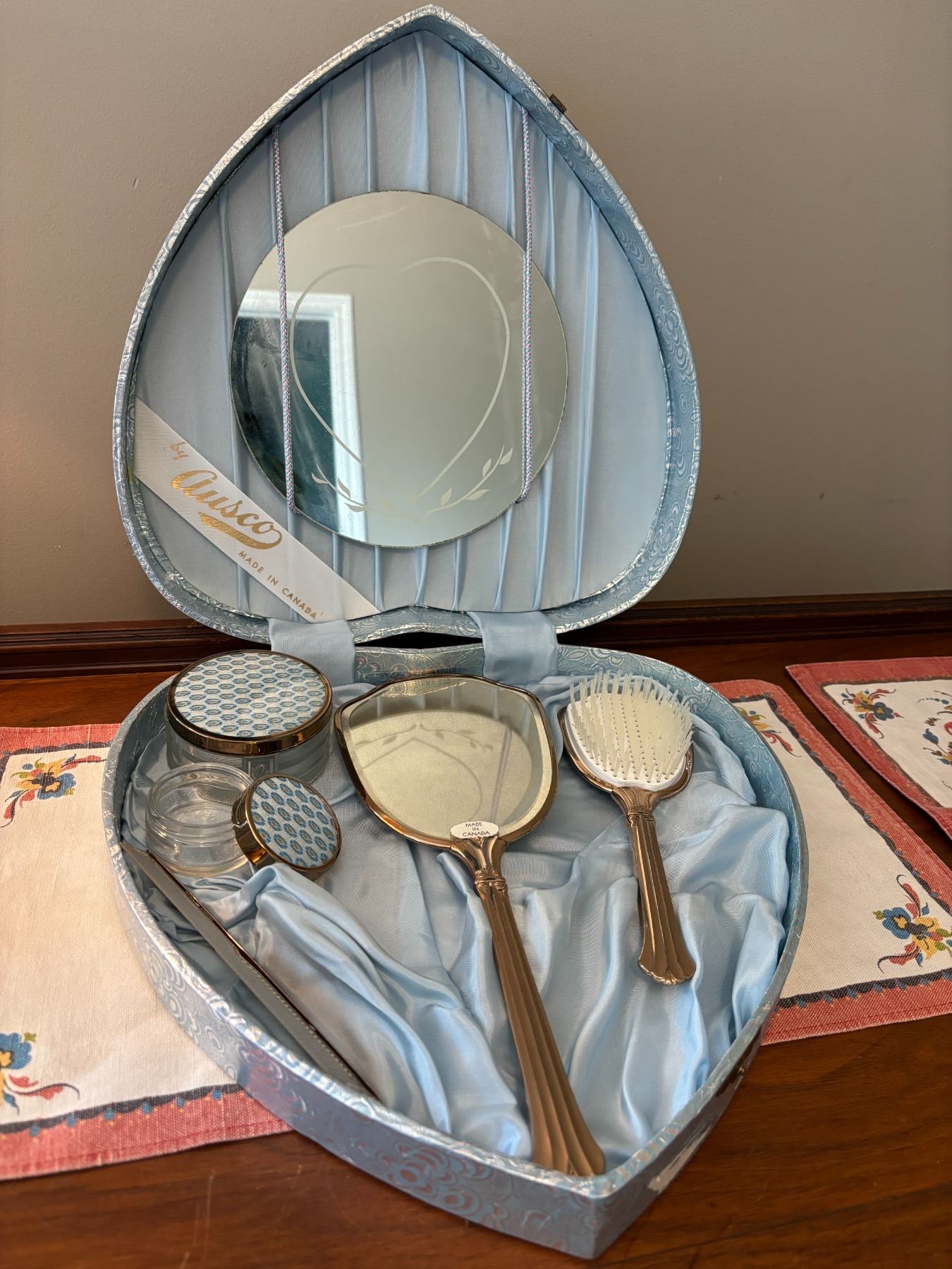 Vanity gift enclosed gift set in heart shaped case by Ausco. Made in Canada. All pieces enclosed with no flaws. Very classy set.