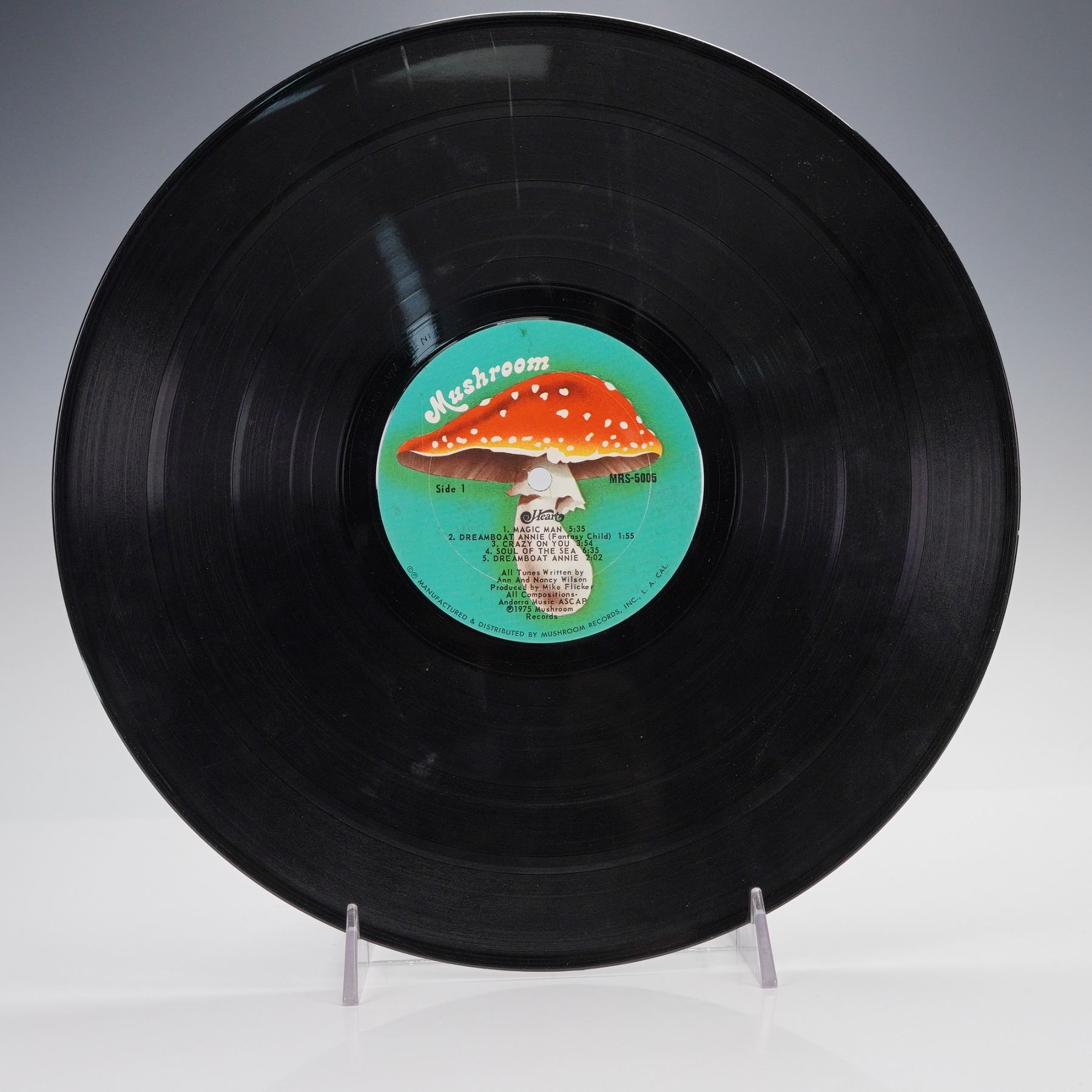An original U.S. pressing of Dreamboat Annie, the groundbreaking debut album by Heart, released by Mushroom Records. This landmark recording introduced the powerhouse duo of Ann and Nancy Wilson to the rock world, blending hard rock intensity with lyrical mysticism and acoustic textures. Featuring signature tracks such as "Magic Man," "Crazy on You," and the ethereal title suite "Dreamboat Annie," the album captures the band's distinctive blend of feminine force and instrumental prowess. The gatefold cover features mirrored photographic portraits of the Wilson sisters, with a heart-shaped graphic enclosing the title, while the reverse continues the theme with track listings inside a crimson heart motif. The vinyl bears Mushroom's iconic red-capped mushroom logo label, and the runout etching reads "IT'S IN THE WAX".