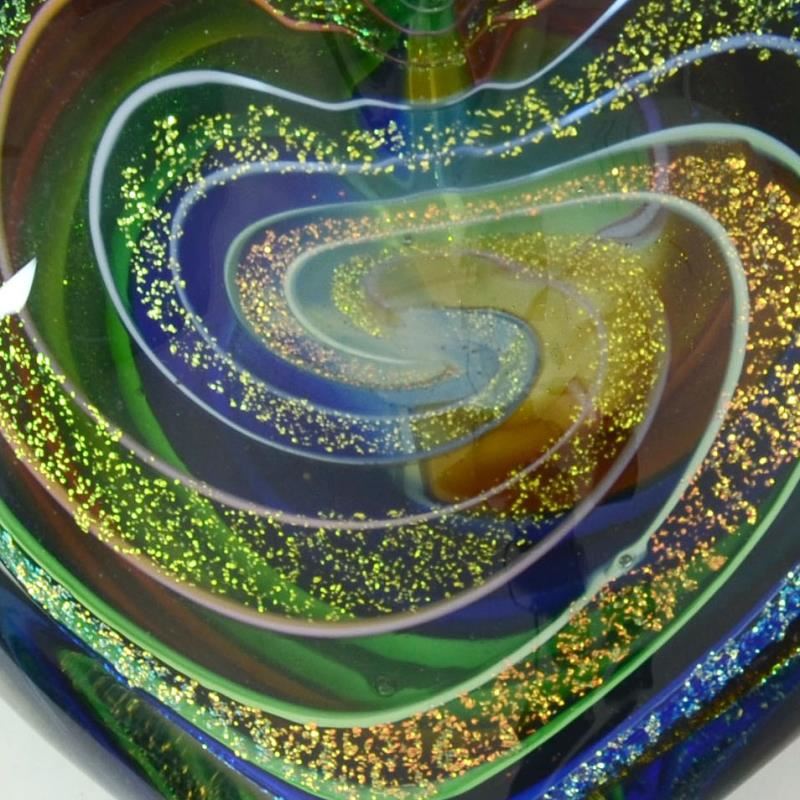 "Heart of Fire (Golden Rainbow)" is a hand blown glass paperweight (second) from Glass Eye Studios. This piece contains ash from the 1980 volcanic eruption of Mount St. Helens. As each piece is individually handcrafted, the pattern in the glass may vary slightly from the image shown. "Second" means very slightly imperfect, but still great quality. Measures approx. 3" x 1" x 3".