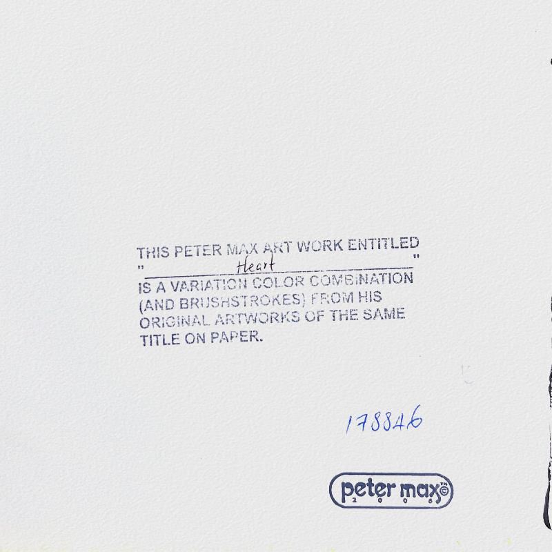 "Heart on Blends" is a one-of-a-kind acrylic mixed media on paper, hand signed by Peter Max. The piece comes custom framed with a backside cutout to display Peter Max Studio registration number 178846 certifying authenticity. Measures approximately 24" x 22" (frame), 10" x 8" (image).