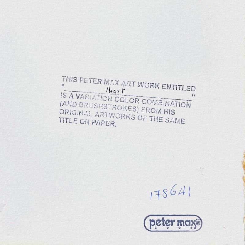 "Heart on Blends" is a one-of-a-kind acrylic mixed media on paper, hand signed by Peter Max. The piece comes custom framed with a backside cutout to display Peter Max Studio registration number 178641 certifying authenticity. Measures approximately 24" x 22" (frame), 10" x 8" (image). This item requires special handling and may have a longer than usual turnaround.
