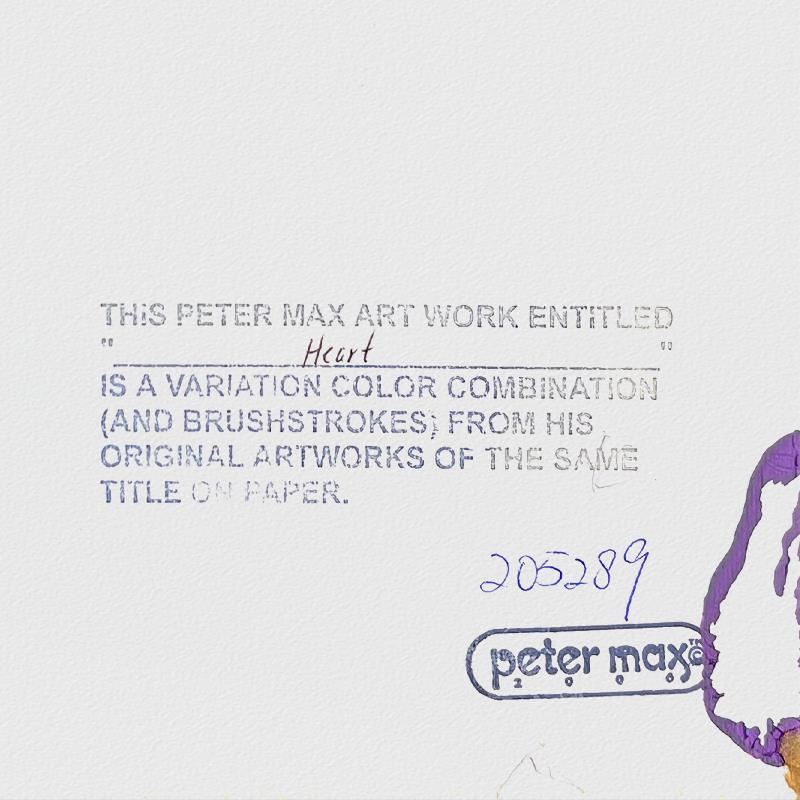 "Heart on Blends" is a one-of-a-kind acrylic mixed media on paper, hand signed by Peter Max. The piece comes custom framed with a backside cutout to display Peter Max Studio registration number 205289 certifying authenticity. Measures approximately 24" x 22" (frame), 10" x 8" (image). This item requires special handling and may have a longer than usual turnaround.