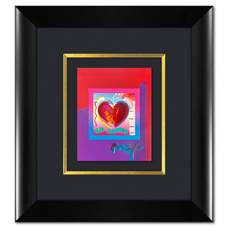 "Heart on Blends" is a one-of-a-kind acrylic mixed media on paper, hand signed by Peter Max. The piece comes custom framed with a backside cutout to display Peter Max Studio registration number 205289 certifying authenticity. Measures approximately 24" x 22" (frame), 10" x 8" (image). This item requires special handling and may have a longer than usual turnaround.