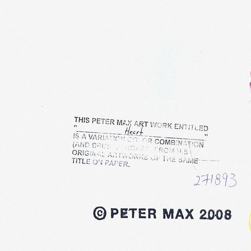 "Heart on Blends" is a one-of-a-kind acrylic mixed media on paper, hand signed by Peter Max. The piece comes custom framed with a backside cutout to display Peter Max Studio registration number 271893 certifying authenticity. Measures approx. 23" x 21" (frame), 10" x 8" (image). This item requires special handling and may have a longer than usual turnaround.