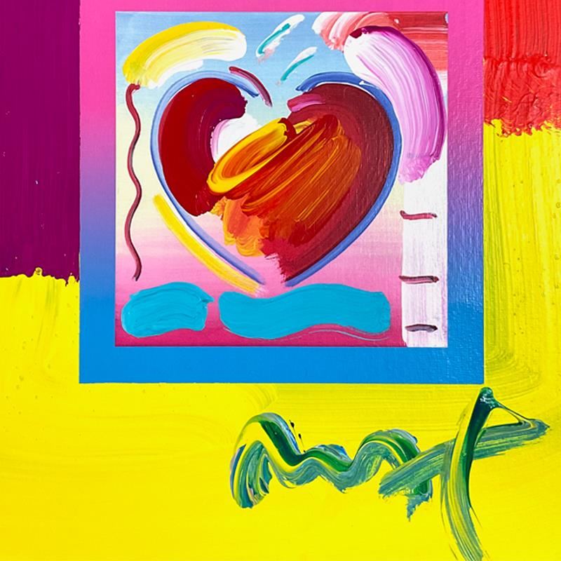 "Heart on Blends" is a one-of-a-kind acrylic mixed media on paper, hand signed by Peter Max. The piece comes custom framed with a backside cutout to display Peter Max Studio registration number 271893 certifying authenticity. Measures approx. 23" x 21" (frame), 10" x 8" (image). This item requires special handling and may have a longer than usual turnaround.