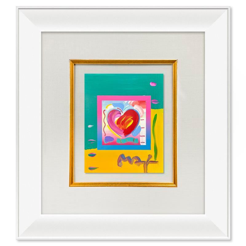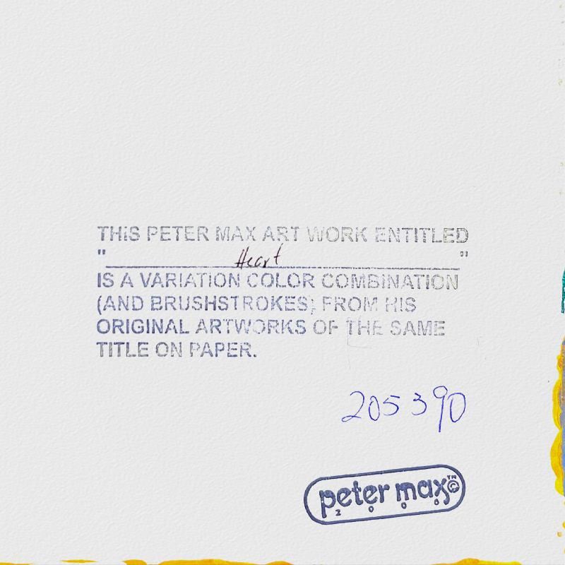 "Heart on Blends" is a one-of-a-kind acrylic mixed media on paper, hand signed by Peter Max. The piece comes custom framed with a backside cutout to display Peter Max Studio registration number 205390 certifying authenticity. Measures approximately 24" x 22" (frame), 10" x 8" (image). This item requires special handling and may have a longer than usual turnaround.