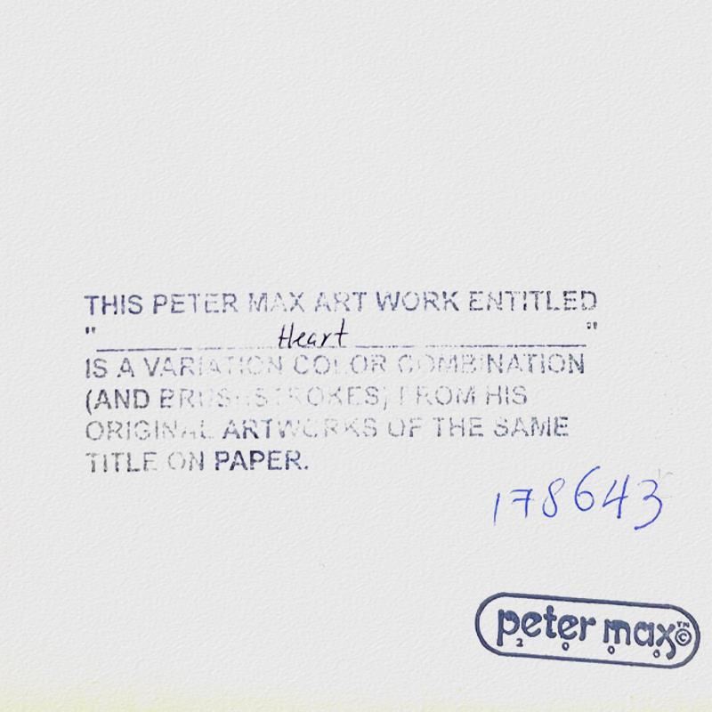 Heart on Blends is a one-of-a-kind acrylic mixed media on paper, hand signed by Peter Max. The piece comes custom framed with a backside cutout to display Peter Max Studio registration number 178643 certifying authenticity. Measures approximately 24 x 22 (frame), 10 x 8 (image).