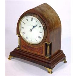 Heart shape mahogany and inlaid burr maple mantel clock with brass column supports and bracket fe…