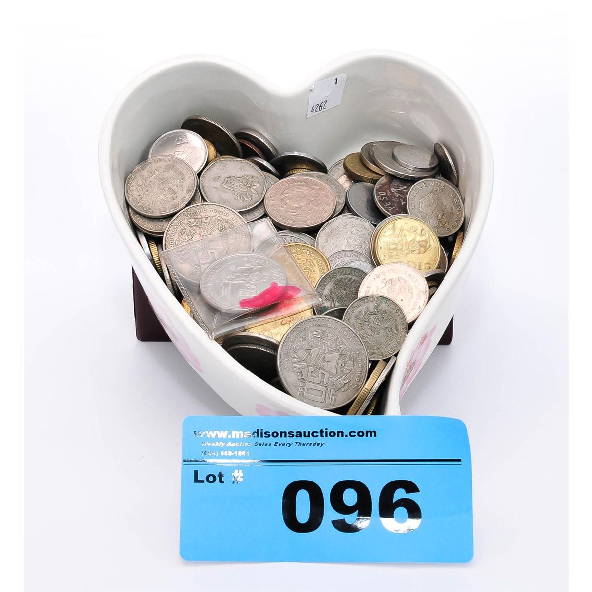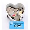 Heart shaped dish filled with assorted world coins