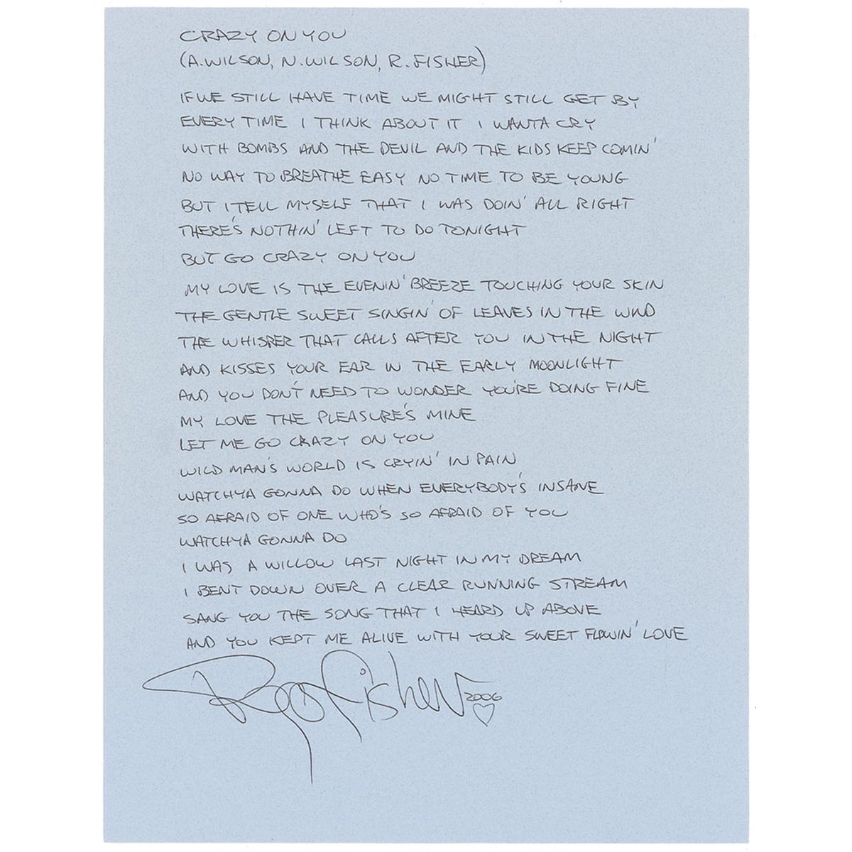 Handwritten souvenir lyrics to ‘Crazy on You’ on a light blue 8.5 x 11 sheet. Songwriter and original guitarist, Roger Fisher, pens the complete lyrics, signed in black ballpoint at the conclusion, “Roger Fisher,” adding a small heart sketch and “2006.” In fine condition.