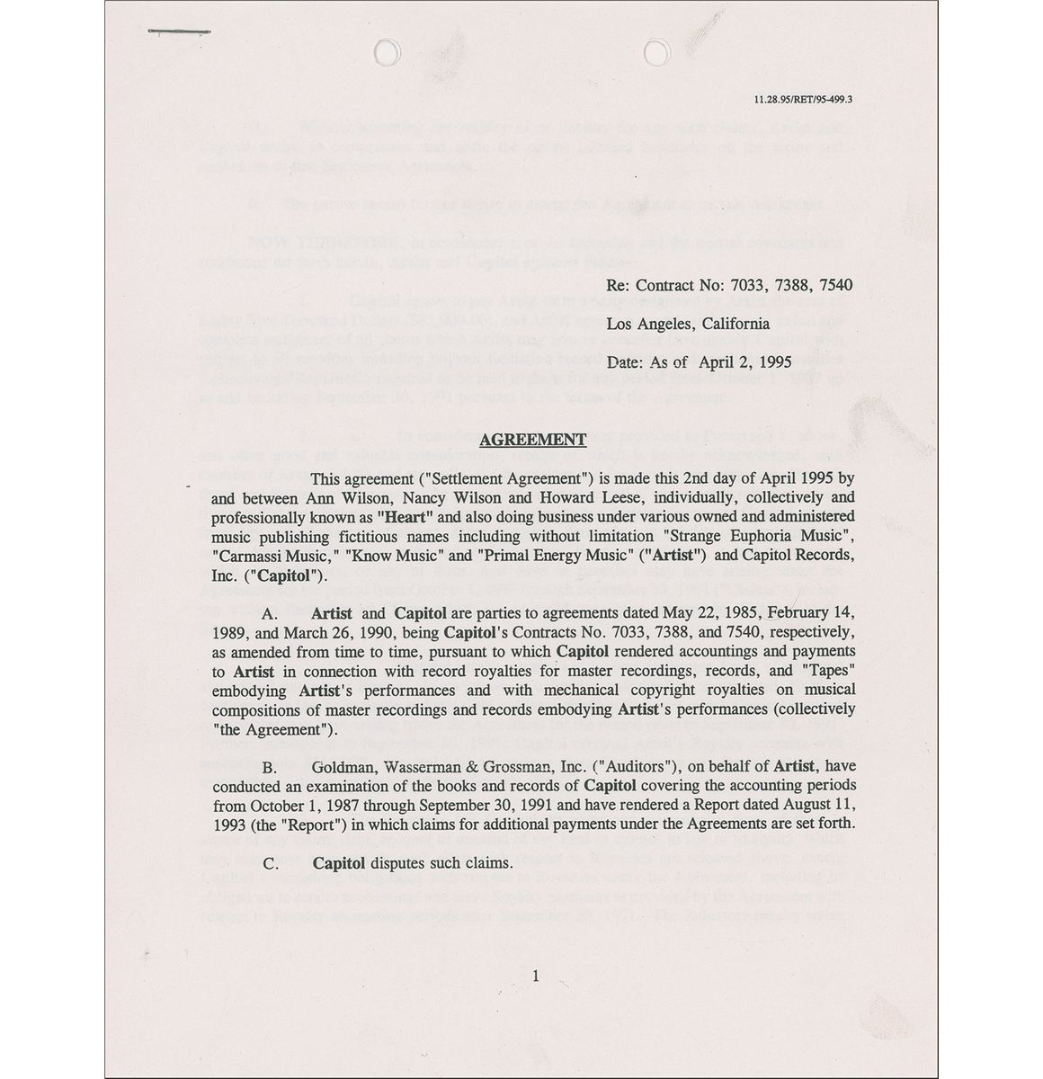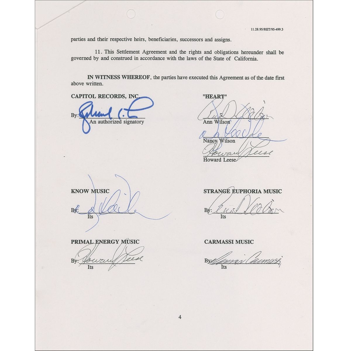 DS, signed “Ann Wilson,” “Nancy Wilson,” and “Howard Leese,” four pages, 8.5 x 11, April 2, 1995. Settlement agreement between the members of Heart and Capitol Records, in which “Capitol disputes such claims” of back royalties owed to the band after a 1993 report is issued by the band’s auditors, confirming discrepancies in the label’s financial dealings, “covering account periods from October 1, 1978 through September 30, 1991.” Capitol, “Without admitting the validity of or liability for any such claims…desire to compromise and settle the claims released hereunder…Capitol agrees to pay Artist…the sum of $85,000, and Artist agrees to accept said payment in full and complete settlement of all claims which Artist may now or hereafter have against Capitol with respect to all royalties including without limitation record royalties and mechanical royalties…required to be paid to them for any period from October 1, 1987 up to an including September 30, 1991.” Two horizontal folds, one lightly affecting the Wilsons’ signatures, a crease to the top left corner, and two punch holes to the top edge of each page, otherwise fine condition. A triumphant settlement for the Wilson sisters, awarded the same year Nancy took time away from the band to concentrate on her family.