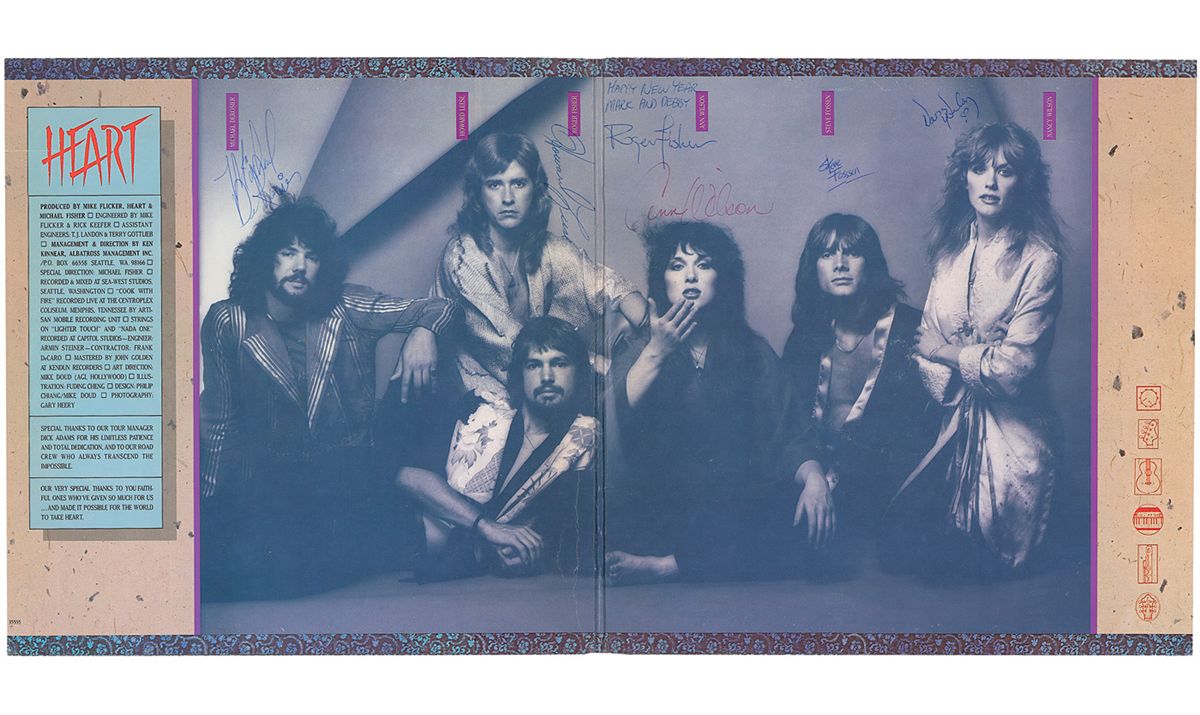 Dog & Butterfly album signed in ballpoint and felt tip on the gatefold by all six band members, Ann Wilson, Nancy Wilson, Michael Derosier, Howard Leese, Roger Fisher, and Steve Fossen. Fisher added the inscription “Happy New Year, Mark and Debby,” above his signature. In fine condition, with a light vertical crease to left portion of gatefold. The record is included.