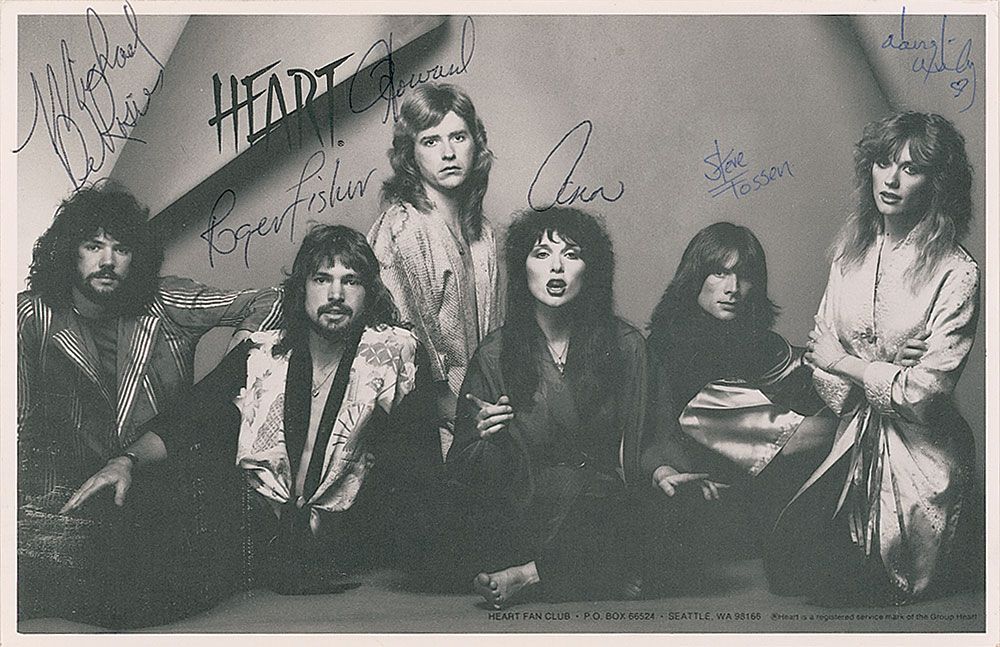 Cardstock 8.5 x 5.5 fan club photo, signed in blue and black ballpoint by all six members: Ann Wilson (first name only), Nancy Wilson, Steve Fossen, Roger Fisher, Michael DeRosier, and Howard Leese (first name only). In fine condition.