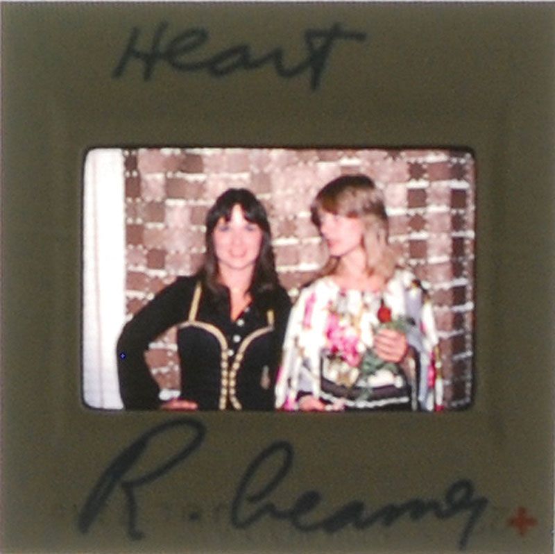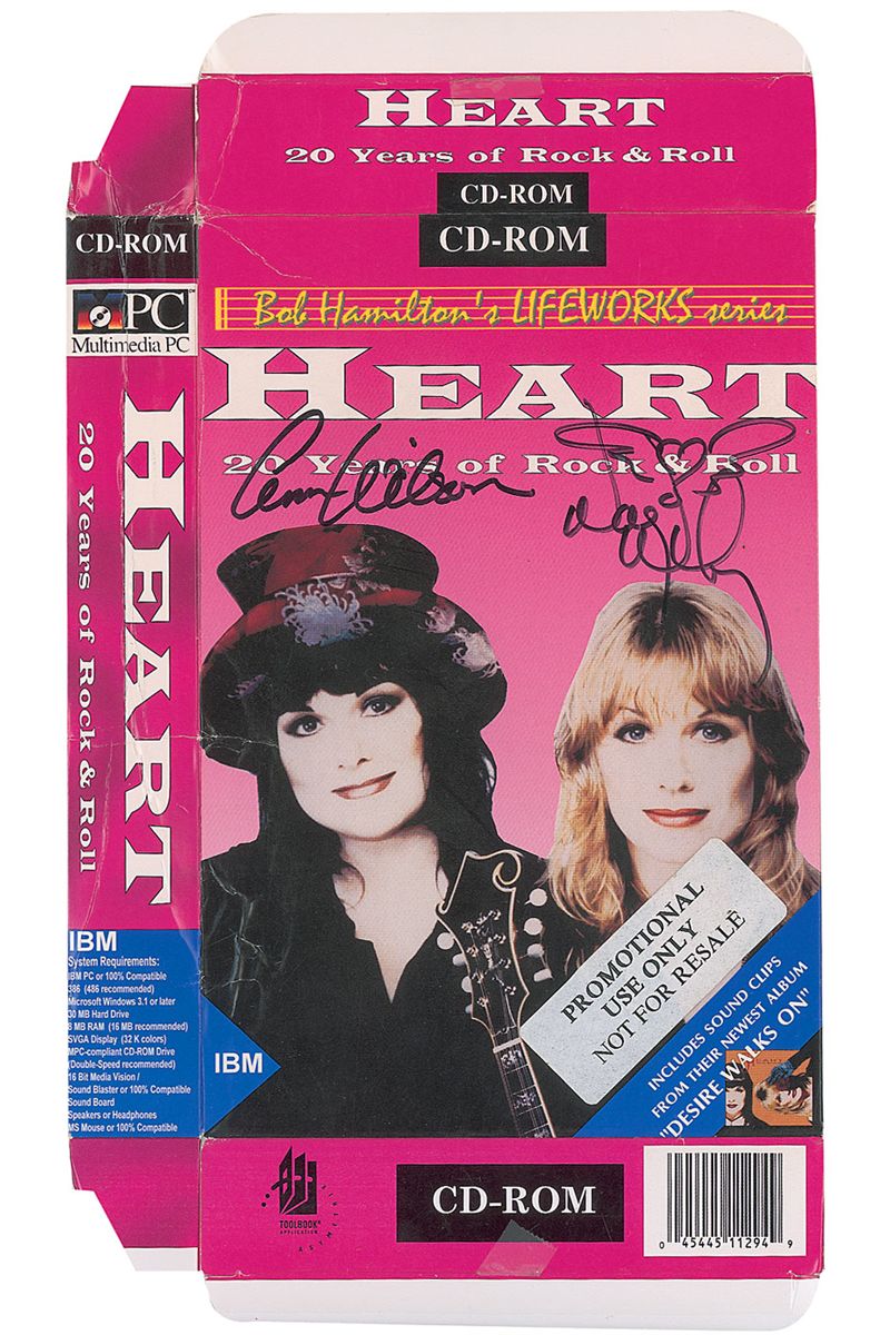 Two items: one flattened box for a promotional CD-ROM, 7 x 12, signed on the front in black felt tip by Ann and Nancy Wilson; and one color slide of both women, the image measuring 1.25 x 1 inside a 2 x 2 cardboard mount bearing an ink notation by the photographer, Richard Creamer. Scattered creases to the box, otherwise fine condition. Provenance: Richard Creamer Estate. Creamer was a famous Rolling Stone photographer very active and well known in the 1970s Los Angeles Rock scene. The collection of Creamer photos offered in this auction were kept in his personal collection and several appeared in magazines.
