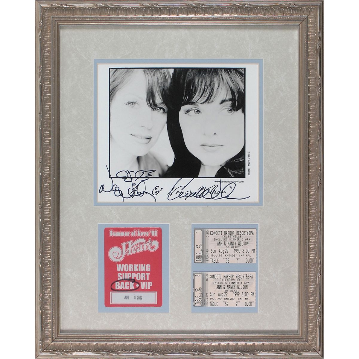 Glossy 10 x 8 publicity photo, signed in black felt tip by Ann and Nancy Wilson, adding a small sketch of a heart with wings. Double-matted and framed with two ticket stubs to a 1999 concert and a Summer of Love ‘02 backstage pass to an overall size of 16.25 x 20.25. In fine condition.