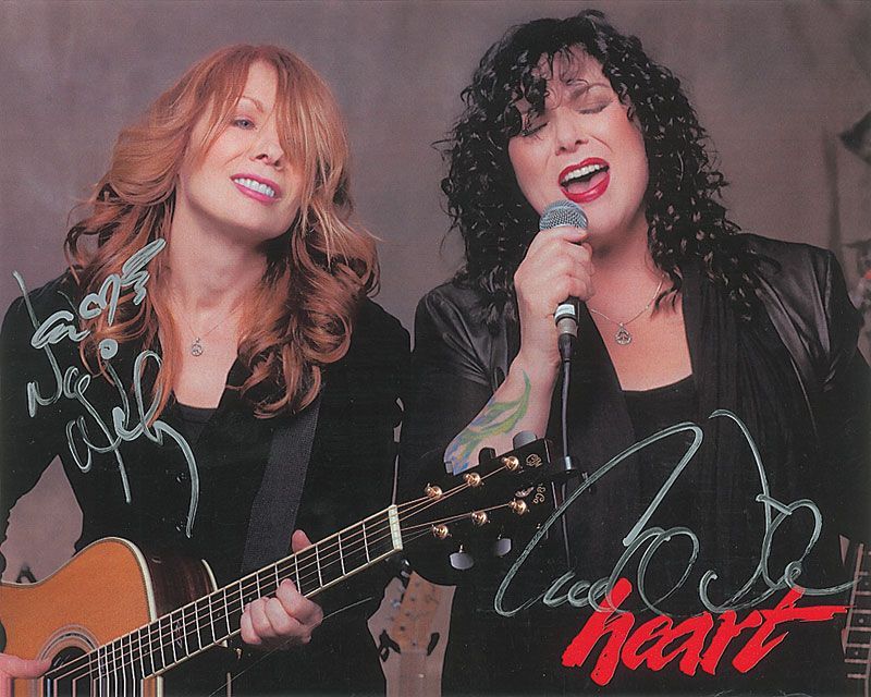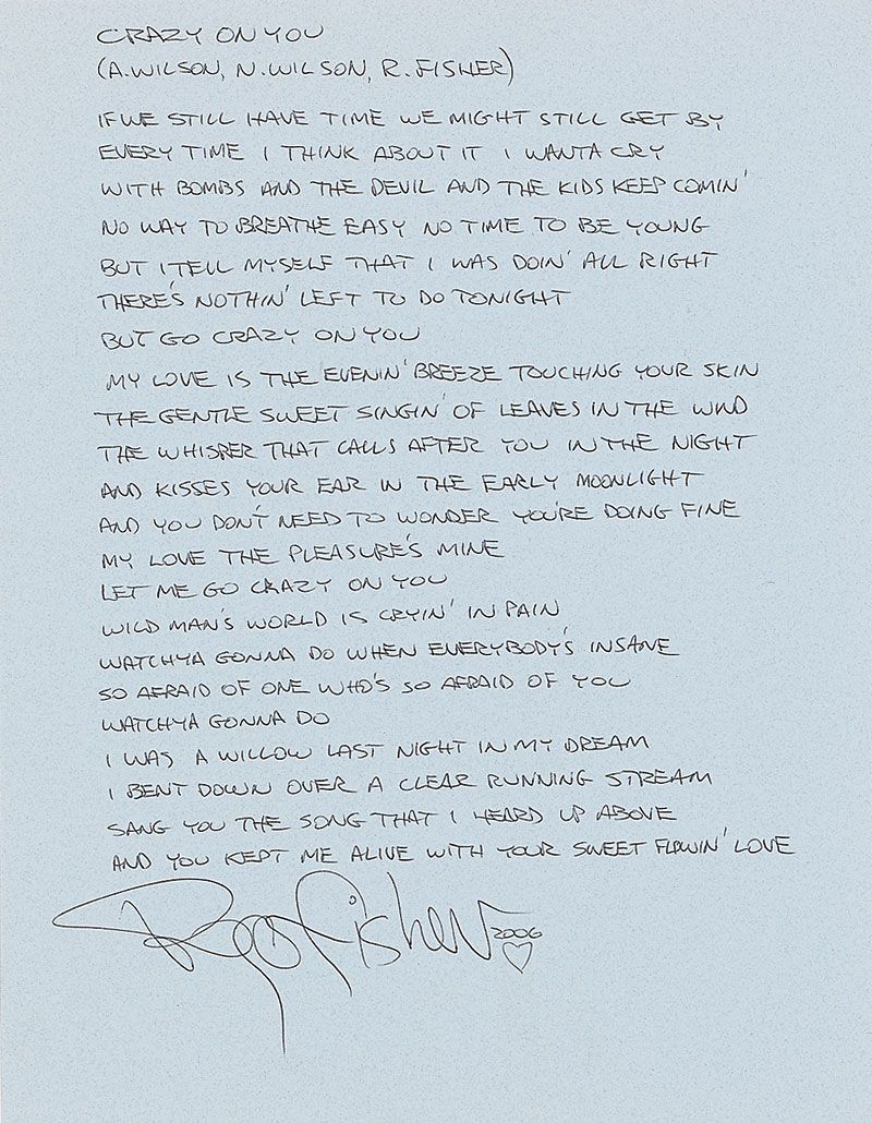Handwritten souvenir lyrics to ‘Crazy on You’ on a light blue 8.5 x 11 sheet. Songwriter and original guitarist, Roger Fisher, pens the complete lyrics, signed in black ballpoint at the conclusion, “Roger Fisher,” adding a small heart sketch and “2006”; and a color 10 x 8 cardstock photo of the Wilson sisters, signed in silver ink by Ann and Nancy Wilson, adding a sketch of a winged heart. In fine condition.