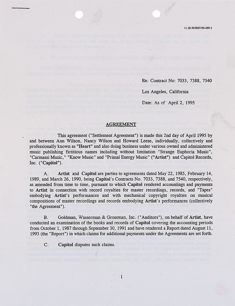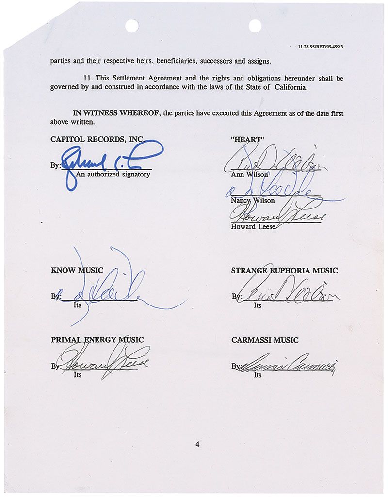 DS, signed “Ann Wilson,” “Nancy Wilson,” and “Howard Leese,” four pages, 8.5 x 11, April 2, 1995. Settlement agreement between the members of Heart and Capitol Records, in which “Capitol disputes such claims” of back royalties owed to the band after a 1993 report issued by the band’s auditors confirmed discrepancies in the label’s financial dealings, “covering account periods from October 1, 1978 through September 30, 1991.” Capitol, “Without admitting the validity of or liability for any such claims…desire to compromise and settle the claims released hereunder…Capitol agrees to pay Artist…the sum of $85,000, and Artist agrees to accept said payment in full and complete settlement of all claims which Artist may now or hereafter have against Capitol with respect to all royalties including without limitation record royalties and mechanical royalties…required to be paid to them for any period from October 1, 1987 up to an including September 30, 1991.” Two horizontal folds, one lightly affecting the Wilsons’ signatures, and expected document wear, otherwise fine condition. A triumphant settlement for the Wilson sisters, awarded the same year Nancy took time away from the band to concentrate on her family.